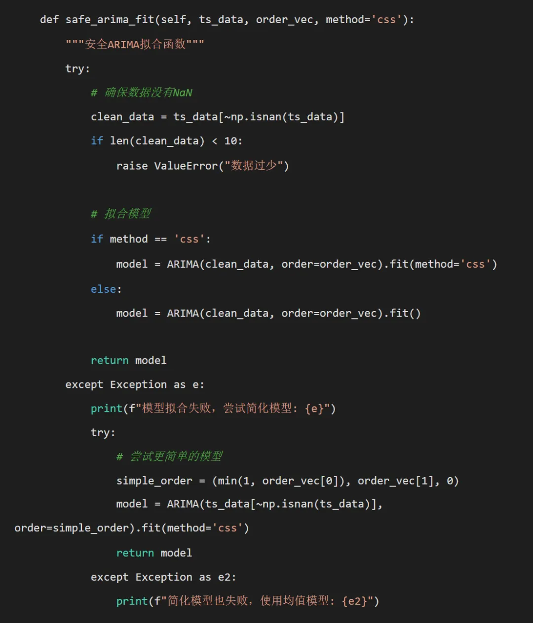 import osimport pandas as pdimport numpy as npimport matplotlib.pyplot as pltimport seaborn as snsfrom datetime import datetime, timedeltaimport warningswarnings.filterwarnings('ignore')# 统计和模型相关from statsmodels.tsa.stattools import adfuller, kpss, pacffrom statsmodels.tsa.arima.model import ARIMAfrom statsmodels.tsa.statespace.sarimax import SARIMAXfrom sklearn.metrics import mean_squared_error, mean_absolute_errorimport scipy.stats as stats# 报告生成from docx import Documentfrom docx.shared import Inchesimport matplotlib.pyplot as pltclass ARModelAnalyzer: def __init__(self): self.desktop_path = os.path.join(os.path.expanduser("~"), "Desktop") self.results_path = os.path.join(self.desktop_path, "Results时间AR") self.create_directories()# 设置中文字体 plt.rcParams['font.sans-serif'] = ['SimHei', 'Microsoft YaHei'] plt.rcParams['axes.unicode_minus'] = False self.selected_diseases = ["influenza", "common_cold", "pneumonia","bacillary_dysentery", "hand_foot_mouth", "hemorrhagic_fever" ] def create_directories(self):"""创建必要的目录结构""" directories = ["Models", "Plots", "Forecasts", "Diagnostics", "Word_Report"]for dir_name in directories: dir_path = os.path.join(self.results_path, dir_name)if not os.path.exists(dir_path): os.makedirs(dir_path)print(f"创建结果目录: {self.results_path}") def load_data(self):"""加载数据""" data_path = os.path.join(self.desktop_path, "Results", "combined_weather_disease_data.csv") try: self.combined_data = pd.read_csv(data_path) self.combined_data['timestamp'] = pd.to_datetime(self.combined_data['timestamp'])print("数据加载成功!")print(f"数据形状: {self.combined_data.shape}")return True except Exception as e:print(f"数据加载失败: {e}")return False def split_data(self):"""划分训练集和测试集""" train_start = '1981-01-01' train_end = '2015-12-31' test_start = '2016-01-01' test_end = '2025-12-31' self.train_data = self.combined_data[ (self.combined_data['timestamp'] >= train_start) & (self.combined_data['timestamp'] <= train_end) ].copy() self.test_data = self.combined_data[ (self.combined_data['timestamp'] >= test_start) & (self.combined_data['timestamp'] <= test_end) ].copy()print(f"训练集时间范围: {self.train_data['timestamp'].min()} 至 {self.train_data['timestamp'].max()}")print(f"测试集时间范围: {self.test_data['timestamp'].min()} 至 {self.test_data['timestamp'].max()}")print(f"训练集样本数: {len(self.train_data)}")print(f"测试集样本数: {len(self.test_data)}") def fast_stationarity_test(self, ts_data):"""快速平稳性检验"""# 处理全零序列if np.all(ts_data == 0) or np.std(ts_data) == 0:return {'is_stationary': True,'p_value': 1,'cv_mean': 0,'cv_var': 0 }# 使用KPSS检验 try: kpss_result = kpss(ts_data, nlags='auto') kpss_pvalue = kpss_result[1] except: kpss_pvalue = np.nan# 简单的视觉检验:检查均值方差是否大致稳定 n_segments = 4 segment_length = len(ts_data) // n_segmentsif segment_length < 10: n_segments = 2 means = [] vars_ = []for i in range(n_segments): start_idx = i * segment_length end_idx = (i + 1) * segment_length if i < n_segments - 1 else len(ts_data) segment = ts_data[start_idx:end_idx] means.append(np.mean(segment)) vars_.append(np.var(segment))# 如果均值或方差的变异系数 > 0.5,认为不平稳 cv_mean = np.std(means) / np.mean(means) if np.mean(means) != 0 else 1 cv_var = np.std(vars_) / np.mean(vars_) if np.mean(vars_) != 0 else 1 is_stationary = (kpss_pvalue > 0.05 if not np.isnan(kpss_pvalue) else True) and cv_mean < 0.5 and cv_var < 0.5return {'is_stationary': is_stationary,'p_value': kpss_pvalue,'cv_mean': cv_mean,'cv_var': cv_var } def safe_ar_order_selection(self, ts_data, max_order=10):"""安全确定AR阶数"""# 处理全零或常数序列if np.all(ts_data == 0) or np.std(ts_data) == 0:return 1 n = len(ts_data) max_order = min(max_order, n // 4) # 更保守的最大阶数if max_order < 1:return 1# 使用PACF的截尾性确定阶数 try: pacf_vals = pacf(ts_data, nlags=max_order, method='ywm') significant_lags = np.where(np.abs(pacf_vals[1:]) > 1.96 / np.sqrt(n))[0] + 1if len(significant_lags) > 0: optimal_p = min(np.max(significant_lags), 5) # 限制最大阶数为5else: optimal_p = 1 except: optimal_p = 1# 确保在合理范围内 optimal_p = max(1, min(optimal_p, max_order))return optimal_p