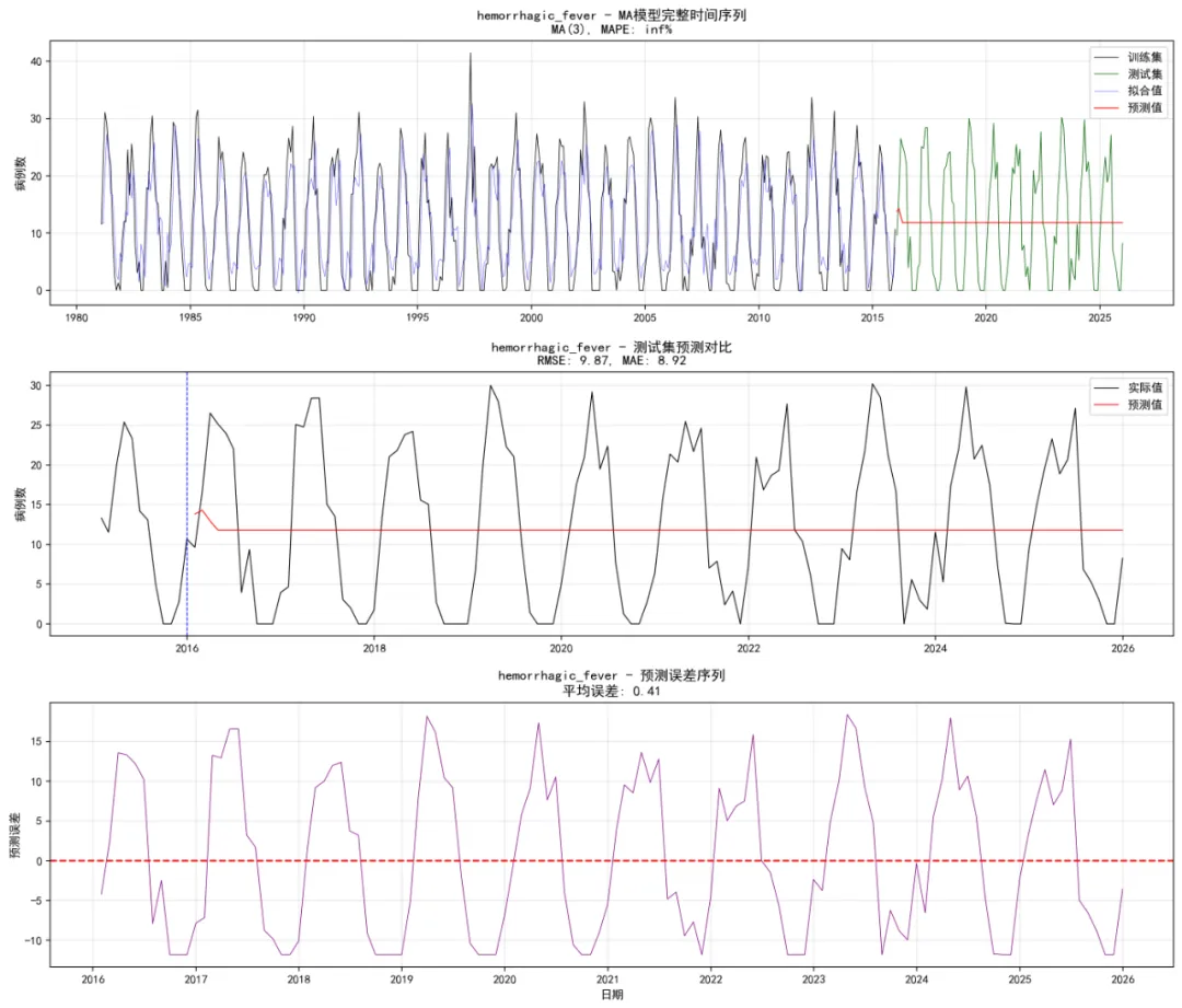 # 完整序列图 ax1.plot(full_dates, full_actual, label='实际值', linewidth=0.6, color='blue') ax1.plot(full_dates[:len(train_ts)], fitted_values, label='拟合值', linewidth=0.4, color='green', alpha=0.7) ax1.plot(full_dates[len(train_ts):], ar_forecast, label='预测值', linewidth=0.6, color='red') ax1.axvline(x=train_dates[-1], color='gray', linestyle='--', alpha=0.7) ax1.set_title(f'{disease} - AR模型完整时间序列\nAR({optimal_p}), MAPE: {test_metrics["mape"]:.2f}%') ax1.set_xlabel('日期') ax1.set_ylabel('病例数') ax1.legend() ax1.grid(True, alpha=0.3)# 2. 测试集详细图(只显示最近几年) recent_start = pd.Timestamp('2015-01-01') mask = full_dates >= recent_start recent_dates = full_dates[mask] recent_actual = full_actual[mask] recent_forecast = full_forecast[mask] ax2.plot(recent_dates, recent_actual, label='实际值', linewidth=0.8, color='black') ax2.plot(recent_dates, recent_forecast, label='预测值', linewidth=0.8, color='red') ax2.axvline(x=pd.Timestamp('2016-01-01'), color='blue', linestyle='--') ax2.set_title( f'{disease} - 测试集预测对比\nRMSE: {test_metrics["rmse"]:.2f}, MAE: {test_metrics["mae"]:.2f}') ax2.set_xlabel('日期') ax2.set_ylabel('病例数') ax2.legend() ax2.grid(True, alpha=0.3) plt.tight_layout()# 保存图形 plt.savefig(os.path.join(self.results_path, 'Plots', f'Full_Series_{disease}.png'), dpi=150, bbox_inches='tight') plt.close()return True except Exception as e:print(f"创建图形时出错: {e}")return False def analyze_disease(self, disease):"""分析单个疾病""" try:print(f"正在分析 {disease}...")# 提取时间序列 train_ts = self.train_data[disease].values.astype(float) test_ts = self.test_data[disease].values.astype(float)# 处理NaN值 train_ts = np.nan_to_num(train_ts, nan=0) test_ts = np.nan_to_num(test_ts, nan=0)# 处理全零序列if np.all(train_ts == 0) or np.std(train_ts) == 0:print(f"{disease} 为常数序列,使用简单预测...") constant_value = 0 if np.all(train_ts == 0) else np.mean(train_ts) test_forecast = np.full(len(test_ts), constant_value) test_metrics = self.calculate_metrics(test_ts, test_forecast)# 创建简单图形 try: fig, ax = plt.subplots(figsize=(12, 6)) ax.plot(self.train_data['timestamp'], train_ts, label='训练集', linewidth=0.6) ax.plot(self.test_data['timestamp'], test_ts, label='测试集实际值', linewidth=0.6) ax.plot(self.test_data['timestamp'], test_forecast, label='预测值', linewidth=0.6, color='red') ax.set_title(f'{disease} - 常数序列预测') ax.set_xlabel('日期') ax.set_ylabel('病例数') ax.legend() ax.grid(True, alpha=0.3) plt.savefig(os.path.join(self.results_path, 'Plots', f'Full_Series_{disease}.png'), dpi=150, bbox_inches='tight') plt.close() except Exception as e:print(f"图形创建失败: {e}")# 返回结果 result_df = pd.DataFrame({'Disease': [disease],'AR_Order': [0],'Diff_Order': [0],'AIC': [np.nan],'BIC': [np.nan],'Test_RMSE': [test_metrics['rmse']],'Test_MAE': [test_metrics['mae']],'Test_MAPE': [test_metrics['mape']] })return result_df# 1. 快速平稳性检验 stationarity = self.fast_stationarity_test(train_ts)if not stationarity['is_stationary']:print(f"{disease} 序列不平稳,进行一阶差分...") train_ts_diff = np.diff(train_ts) diff_order = 1else: train_ts_diff = train_ts diff_order = 0# 2. 安全确定AR阶数 optimal_p = self.safe_ar_order_selection(train_ts_diff, max_order=8)print(f"{disease} 最优AR阶数: {optimal_p}")# 3. 安全拟合AR模型 ar_model = self.safe_arima_fit(train_ts, order_vec=(optimal_p, diff_order, 0), method='css')# 4. 预测 forecast_horizon = len(test_ts) try:if hasattr(ar_model, 'forecast'): ar_forecast = ar_model.forecast(steps=forecast_horizon)else: ar_forecast = ar_model.forecast(forecast_horizon) except:print("预测失败,使用最后观测值") last_value = train_ts[-1] if len(train_ts) > 0 else 0 ar_forecast = np.full(forecast_horizon, last_value)# 5. 计算评估指标 test_forecast = ar_forecast[:len(test_ts)] test_actual = test_ts[:len(test_forecast)] test_metrics = self.calculate_metrics(test_actual, test_forecast)# 6. 图形输出 self.create_batch_plots(disease, train_ts, test_ts, ar_model, ar_forecast, optimal_p, test_metrics)# 7. 保存预测结果 forecast_df = pd.DataFrame({'Date': self.test_data['timestamp'].values[:len(test_forecast)],'Actual': test_actual,'Forecast': test_forecast,'Error': test_actual - test_forecast }) forecast_df.to_csv(os.path.join(self.results_path, 'Forecasts', f'Forecast_Results_{disease}.csv'), index=False)# 8. 返回结果 aic = ar_model.aic if hasattr(ar_model, 'aic') else np.nan bic = ar_model.bic if hasattr(ar_model, 'bic') else np.nan result_df = pd.DataFrame({'Disease': [disease],'AR_Order': [optimal_p],'Diff_Order': [diff_order],'AIC': [aic],'BIC': [bic],'Test_RMSE': [test_metrics['rmse']],'Test_MAE': [test_metrics['mae']],'Test_MAPE': [test_metrics['mape']] })print(f"{disease} 分析完成! MAPE: {test_metrics['mape']:.2f}%")return result_df except Exception as e:print(f"分析 {disease} 时出错: {e}")# 返回一个包含NaN值的标准数据框return pd.DataFrame({'Disease': [disease],'AR_Order': [np.nan],'Diff_Order': [np.nan],'AIC': [np.nan],'BIC': [np.nan],'Test_RMSE': [np.nan],'Test_MAE': [np.nan],'Test_MAPE': [np.nan] }) def create_summary_visualizations(self, model_results):"""创建汇总可视化"""print("创建汇总可视化...")