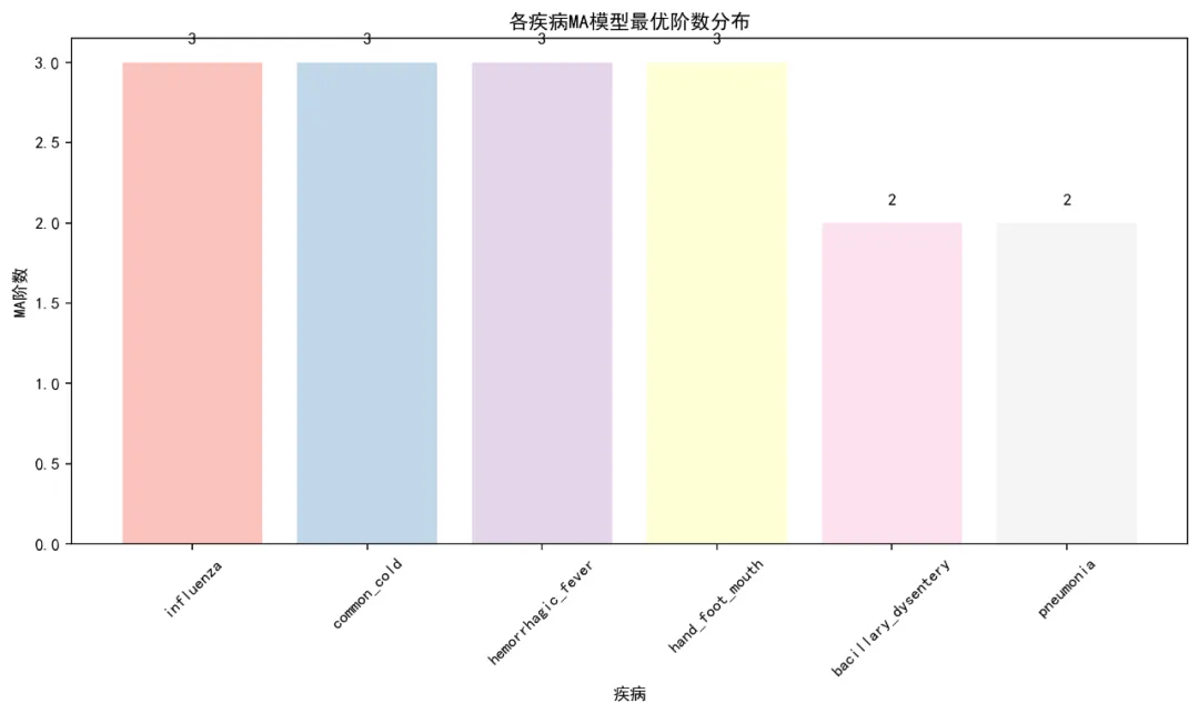 # 性能比较图(处理NaN值) performance_data = model_results[~model_results['Test_MAPE'].isna()]if len(performance_data) > 0: plt.figure(figsize=(10, 6)) performance_data = performance_data.sort_values('Test_MAPE', ascending=False) bars = plt.bar(performance_data['Disease'], performance_data['Test_MAPE'], alpha=0.8)# 添加数值标签for bar in bars: height = bar.get_height() plt.text(bar.get_x() + bar.get_width() / 2., height + 0.1, f'{height:.1f}%', ha='center', va='bottom') plt.title('AR模型预测性能比较\n测试集平均绝对百分比误差 (MAPE)') plt.xlabel('疾病') plt.ylabel('MAPE (%)') plt.xticks(rotation=45) plt.grid(True, alpha=0.3) plt.tight_layout() plt.savefig(os.path.join(self.results_path, 'Plots', 'Model_Performance_Comparison.png'), dpi=150, bbox_inches='tight') plt.close()else:print("没有有效的MAPE数据创建性能比较图")# 准确度热力图 accuracy_data = model_results[['Disease', 'Test_RMSE', 'Test_MAE', 'Test_MAPE']].copy() accuracy_long = accuracy_data.melt(id_vars=['Disease'], value_vars=['Test_RMSE', 'Test_MAE', 'Test_MAPE'], var_name='Metric', value_name='Value')# 移除NaN值 accuracy_long = accuracy_long[~accuracy_long['Value'].isna()]if len(accuracy_long) > 0:# 创建数据透视表 heatmap_data = accuracy_long.pivot(index='Disease', columns='Metric', values='Value') plt.figure(figsize=(8, 6)) sns.heatmap(heatmap_data, annot=True, fmt='.2f', cmap='YlOrRd', cbar_kws={'label': '误差值'}) plt.title('AR模型预测准确度热力图') plt.tight_layout() plt.savefig(os.path.join(self.results_path, 'Plots', 'Accuracy_Heatmap.png'), dpi=150, bbox_inches='tight') plt.close()else:print("没有有效的准确度数据创建热力图") def generate_summary_report(self, model_results, start_time, end_time):"""生成总结报告"""print("生成总结报告...") report_path = os.path.join(self.results_path, 'Modeling_Summary_Report.txt') with open(report_path, 'w', encoding='utf-8') as f: f.write("=== AR模型建模优化总结报告 ===\n\n") f.write(f"建模时间: {datetime.now().strftime('%Y-%m-%d %H:%M:%S')}\n") f.write(f"总耗时: {(end_time - start_time).total_seconds() / 60:.2f} 分钟\n") f.write("训练集范围: 1981-01-01 至 2015-12-31\n") f.write("测试集范围: 2016-01-01 至 2025-12-31\n") f.write(f"分析的疾病数量: {len(self.selected_diseases)}\n\n") f.write("优化措施:\n") f.write("- 使用pandas加速数据读取和处理\n") f.write("- 简化平稳性检验流程\n") f.write("- 使用PACF安全确定AR阶数\n") f.write("- 使用CSS方法加速模型拟合\n") f.write("- 增加错误处理和回退机制\n") f.write("- 降低图形输出质量以加快保存速度\n\n") f.write("各疾病模型性能:\n") f.write(model_results.to_string(index=False)) f.write("\n\n性能排名 (按MAPE升序):\n") ranked_models = model_results.sort_values('Test_MAPE', na_position='last') f.write(ranked_models.to_string(index=False))# 安全获取最佳模型 valid_models = ranked_models[~ranked_models['Test_MAPE'].isna()]if len(valid_models) > 0: best_model = valid_models.iloc[0] best_mape = best_model['Test_MAPE'] avg_mape = valid_models['Test_MAPE'].mean()else: best_model = None best_mape = np.nan avg_mape = np.nan f.write(f"\n\n最佳预测模型: {best_model['Disease'] if best_model is not None else 'NA'}\n") f.write(f"最佳MAPE: {best_mape:.2f}%\n"if not np.isnan(best_mape) else"最佳MAPE: NA\n") f.write(f"平均MAPE: {avg_mape:.2f}%\n"if not np.isnan(avg_mape) else"平均MAPE: NA\n") f.write("\n文件输出:\n") f.write("1. Models/All_Model_Results.csv - 所有模型结果\n") f.write("2. Plots/ - 汇总可视化图表\n") f.write("3. Forecasts/ - 各疾病预测结果\n") f.write("4. Modeling_Summary_Report.txt - 本报告\n") def generate_word_report(self, model_results, ranked_models):"""生成Word分析报告"""print("生成Word分析报告...") try:# 创建Word文档 doc = Document()# 标题页 doc.add_heading('AR模型时间序列分析报告', 0) doc.add_paragraph(f"报告生成时间: {datetime.now().strftime('%Y年%m月%d日 %H:%M:%S')}") doc.add_paragraph(f"分析疾病数量: {len(model_results)}") doc.add_paragraph("训练集: 1981-2015") doc.add_paragraph("测试集: 2016-2025") doc.add_page_break()# 执行摘要 doc.add_heading('执行摘要', level=1) doc.add_paragraph("本报告对6种主要传染病的时间序列数据进行了自回归(AR)模型分析。")# 安全添加最佳模型信息 valid_models = ranked_models[~ranked_models['Test_MAPE'].isna()]if len(valid_models) > 0: best_model = valid_models.iloc[0] best_mape = best_model['Test_MAPE'] avg_mape = valid_models['Test_MAPE'].mean() doc.add_paragraph(f"最佳预测模型: {best_model['Disease']} (MAPE: {best_mape:.2f}%)") doc.add_paragraph(f"平均预测准确率: {avg_mape:.2f}%")else: doc.add_paragraph("所有模型均未能成功拟合") doc.add_paragraph()# 方法学 doc.add_heading('方法学', level=1) doc.add_paragraph("1. 数据划分: 使用1981-2015年数据作为训练集,2016-2025年数据作为测试集") doc.add_paragraph("2. 平稳性检验: 使用KPSS检验和变异系数分析") doc.add_paragraph("3. 模型选择: 基于PACF截尾性确定AR模型阶数") doc.add_paragraph("4. 模型拟合: 使用条件平方和(CSS)方法拟合AR模型") doc.add_paragraph("5. 预测评估: 使用RMSE、MAE和MAPE指标评估预测性能") doc.add_paragraph()# 模型性能汇总表 doc.add_heading('模型性能汇总', level=1) doc.add_paragraph()# 创建性能表格 table = doc.add_table(rows=len(model_results) + 1, cols=5) table.style = 'Light Grid Accent 1'# 表头 headers = table.rows[0].cells headers[0].text = '疾病' headers[1].text = 'AR阶数' headers[2].text = 'RMSE' headers[3].text = 'MAE' headers[4].text = 'MAPE'# 表格数据for i, (_, row) in enumerate(model_results.iterrows()): cells = table.rows[i + 1].cells cells[0].text = str(row['Disease']) cells[1].text = str(row['AR_Order']) cells[2].text = f"{row['Test_RMSE']:.2f}"if not np.isna