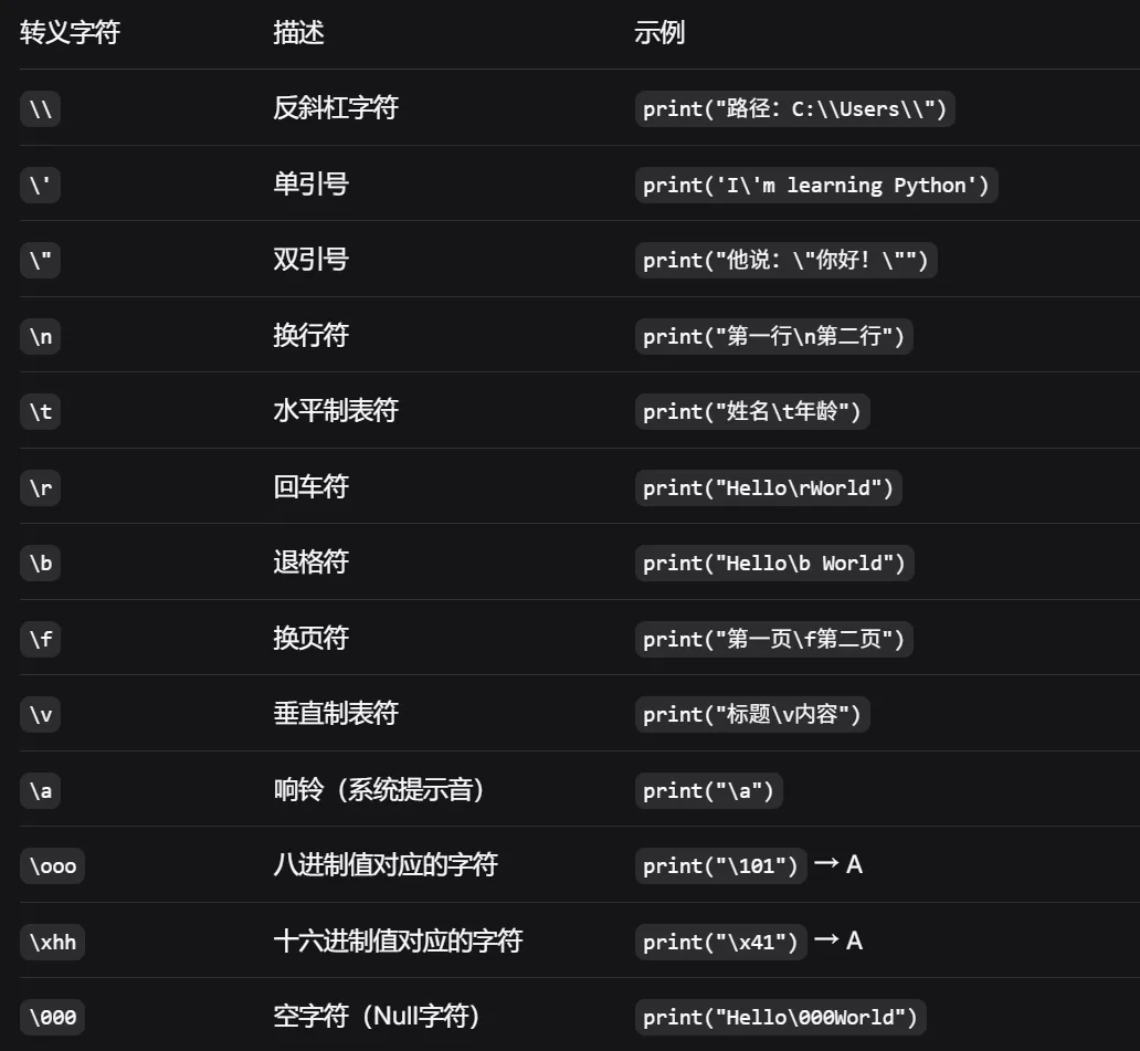 ① 八进制和十六进制表示字符print("八进制101: \101") # 输出: Aprint("十六进制41: \x41") # 输出: Aprint("十六进制表示笑脸: \xE2\x98\xBA") # 输出: ☺