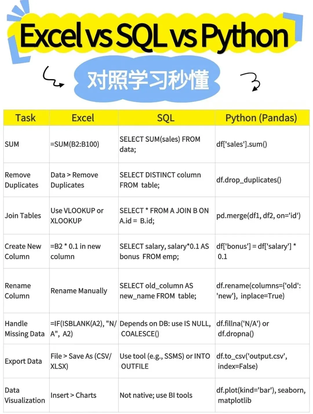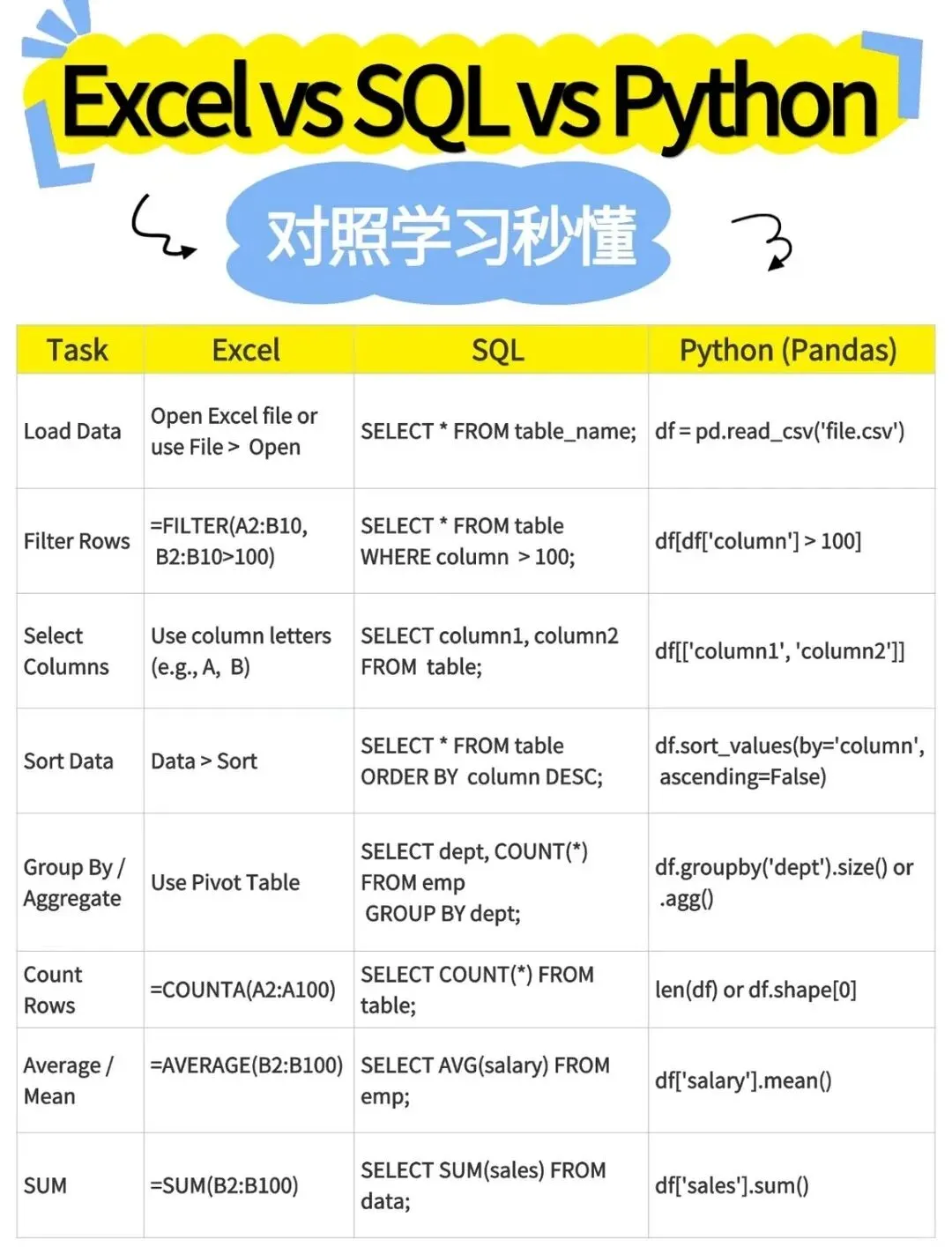 从Excel到SQL和Python,不是学习全新的技能,而是为你已有的超能力装备更强大的工具。现在,去用你的表格思维征服编程世界吧!