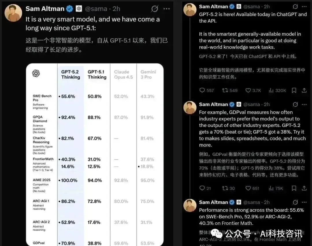 山姆・奥特曼表示,GPT-5.2 是 OpenAI 很长一段时间以来最大的一次升级。
