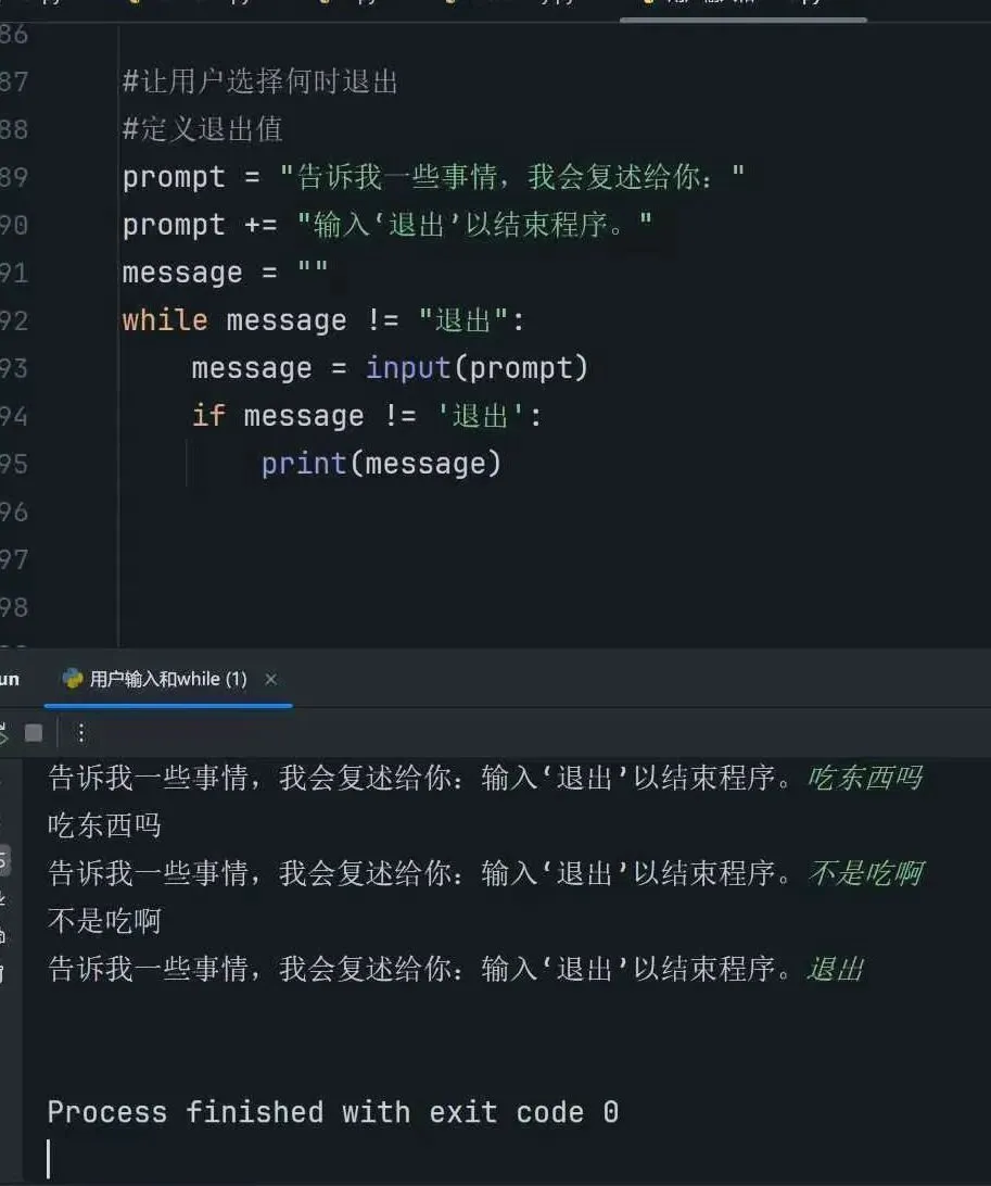 3.只要用户输入“退出”后Python停止执行while循环,整个程序结束。