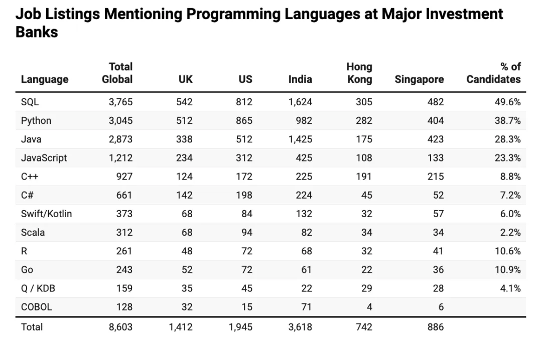 efinancialcareers总结了13家大型投行的招聘信息,发现Python虽是所有行业中最受欢迎的语言,但是大型投行另有偏好,那就是SQL。