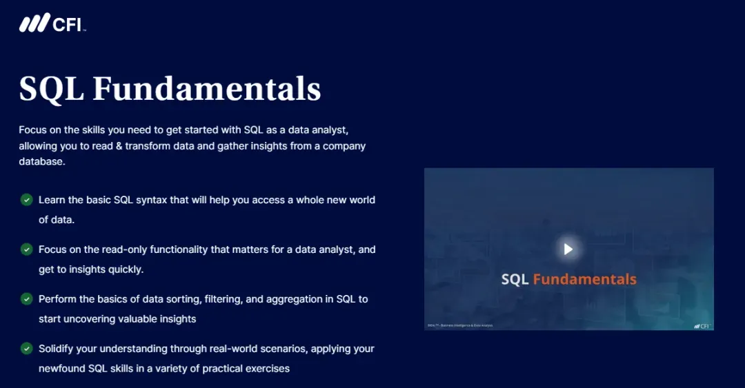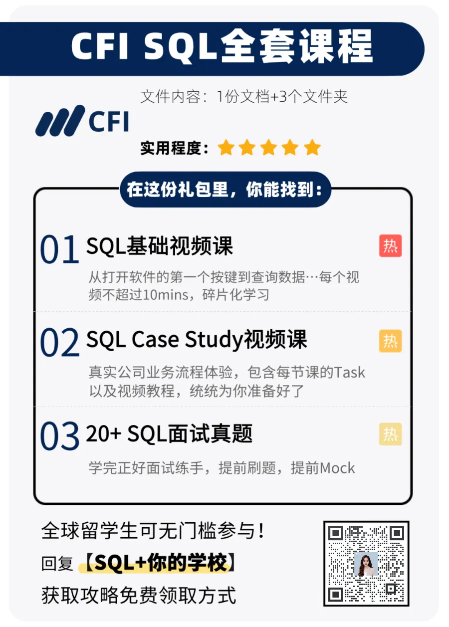 并且,SQL语法接近英语口语。也就是说,你几乎可以用英语来阅读理解一段SQL的意思。想要入门非常简单。目前市面上大部分SQL课程只注重技能讲解,和对于金融业务实践结合相对较薄弱。为了帮大家在学技术的同时,更好结合业务提升对数据的理解,高盛和大小摩向商科生推荐了:知名金融论坛CFI的SQL基础课程。很适合新手入门学习👇