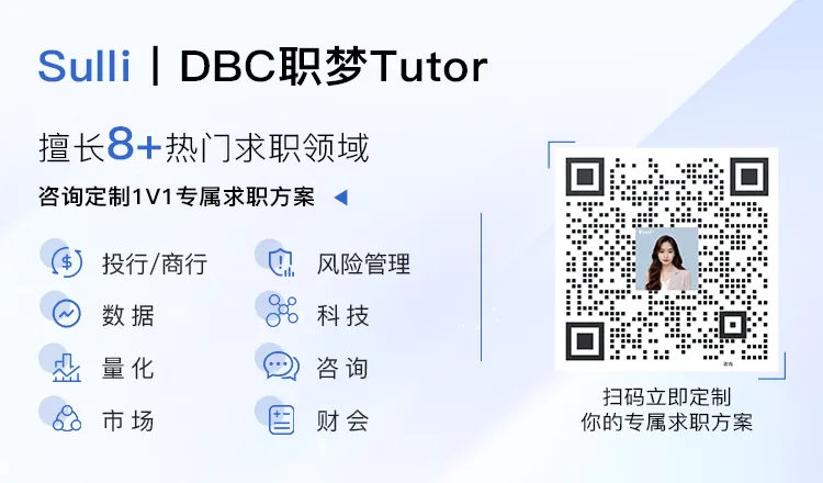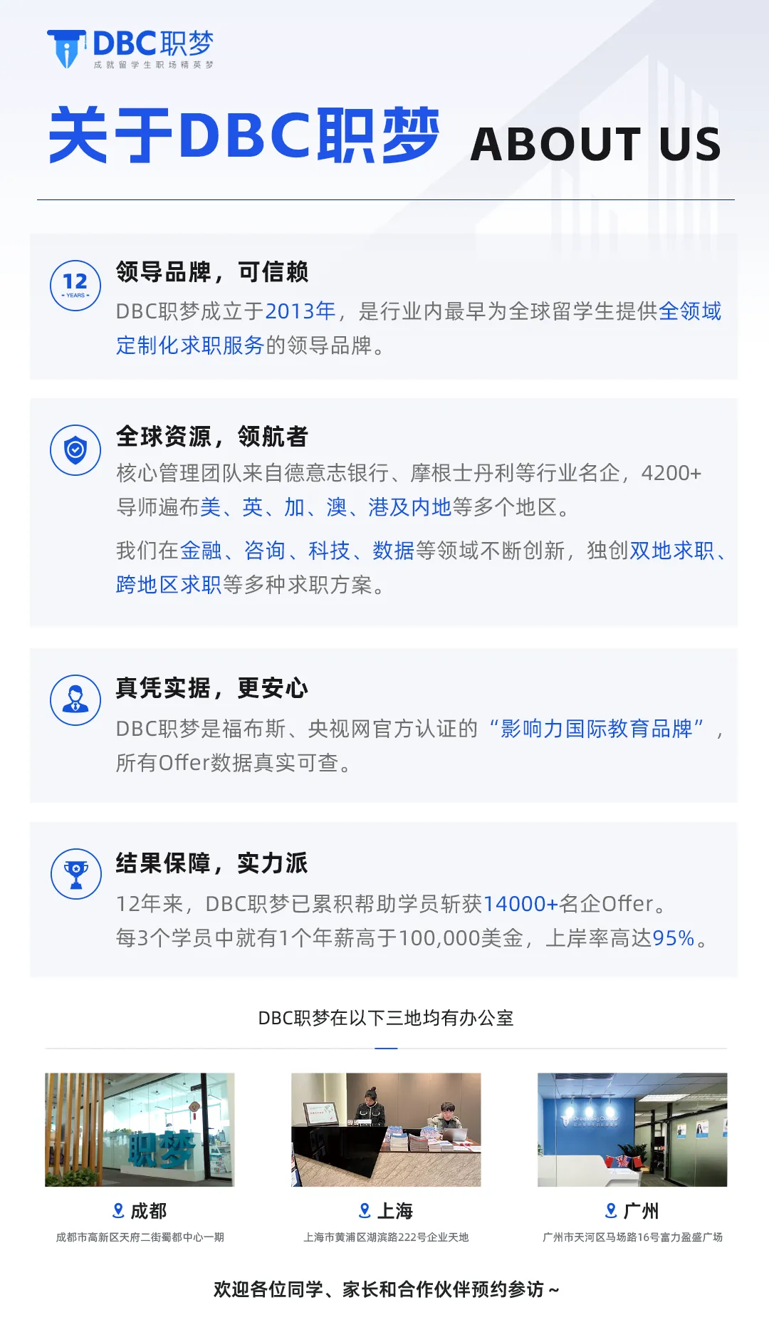 成就留学生职场精英梦,是DBC职梦成立12年来一直在坚持的使命。在求职的旅程中,DBC职梦致力于成为每一位留学生的坚实后盾。无论你是在简历优化上需要专业建议,还是在面试准备中需要强化技巧,DBC职梦都会为你提供全面的支持和指导,助你顺利迈向理想的高薪职业生涯。扫码添加DBC求职顾问,回复【留学生】即可免费咨询