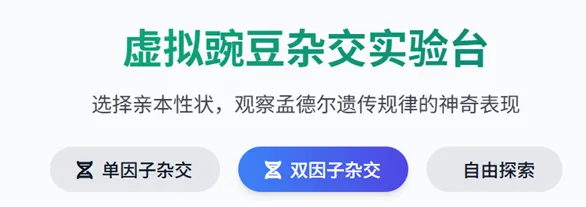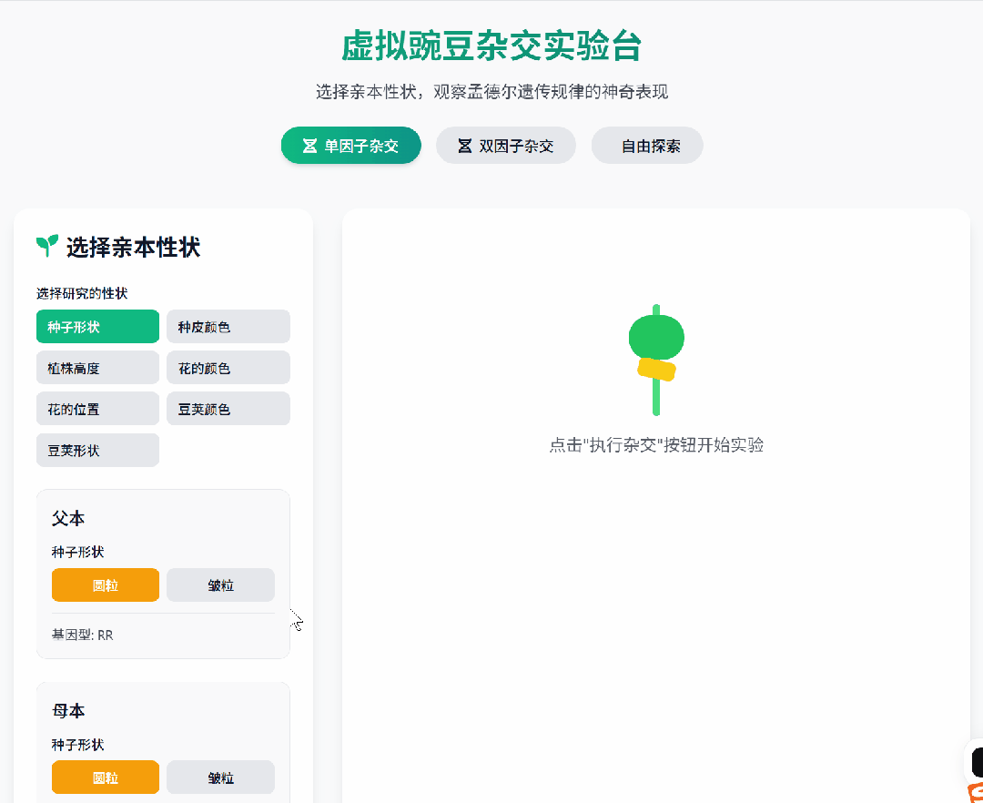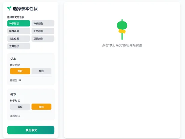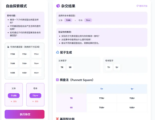 1. 学生选择亲本性状(高茎 / 矮茎、黄圆 / 绿皱),点击 “杂交”,系统生成配子,自动绘制棋盘法,统计后代基因型、表现型比例;学生手动设置杂交组合,验证自己的推理是否正确。