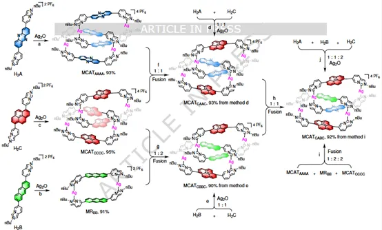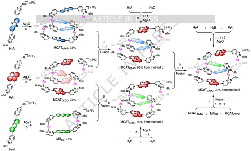 考虑到银–氮杂环卡宾键(Ag–CNHC)的不稳定性,以及氮杂环卡宾配体与银(I)离子能够高效组装形成双组分金属 [2] 索烃,我们随后开展实验,探究这类异配组装体系能否通过均配组装体的重排反应生成。实验结果证实,将MCATAAAA与MCATCCCC按 1:1 的比例混合,反应可在数秒内快速转化为异配金属 [2] 索烃MCATCAAC(图 2,方法 f),氢核磁共振谱结果也印证了这一结论。有趣的是,尽管配体前驱体H2B与氧化银反应仅能生成双核金属环MRBB,而非金属 [2] 索烃,但将MCATCCCC与MRBB按 1:2 的比例在氘代乙腈中混合,二者仍可快速转化为MCATCBBC(图 2,方法 g),氢核磁共振谱同样证实了该转化过程。这些融合反应表明,通过整合自分类选择性生成的异配金属 [2] 索烃MCATCAAC与MCATCBBC,是热力学上更具优势的反应产物。