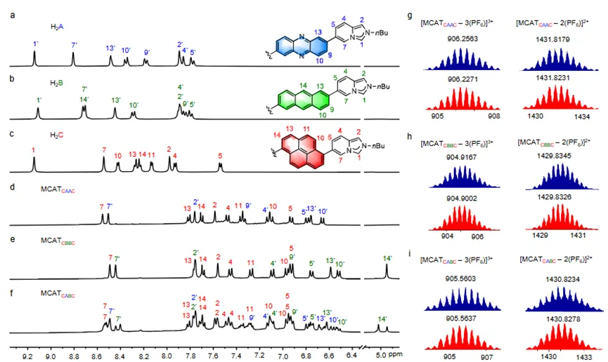 基于上述实验结果,作者探究能否通过两种异配金属 [2] 索烃的进一步融合,实现体系结构复杂度的提升。作者对异配金属 [2] 索烃MCATCAAC与MCATCBBC的结构进行了细致分析,发现二者不仅具有相同的芘桥连外层配体,其内层配体的结构差异也仅为两个原子。鉴于MCATCAAC与MCATCBBC在结构和组成上的相似性,我们推测二者的融合反应能够生成序列更为多样的异配金属 [2] 索烃。将两种异配金属 [2] 索烃MCATCAAC与MCATCBBC按 1:1 的摩尔比在氘代乙腈中室温混合(图 2,方法 h),核磁共振谱图中出现了一组新的复杂信号峰(图 4f)。这一现象表明体系通过自分类过程形成了一种新型组装体,我们将其命名为MCATCABC。此外,反应混合物的氢扩散排序核磁共振谱仅显示出一个扩散系数,说明体系中仅生成了单一化学计量比的组装体。电喷雾电离质谱数据进一步证实了组成为[Ag4(A)(B)(C)2]的产物生成(图 4i)。