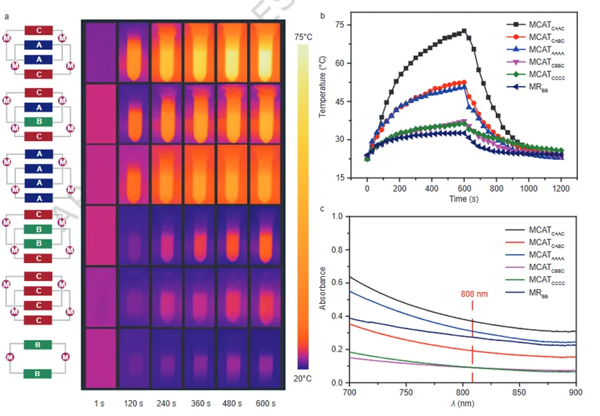 为了准确探究不同共轭平面与堆叠模式对光热转换效率的影响,作者对双核金属环MRBB以及五种具有不同组分序列的金属[2]索烃(MCATAAAA、MCATCCCC、MCATCAAC、MCATCBBC与MCATCABC)的近红外光热转换性能展开了研究。