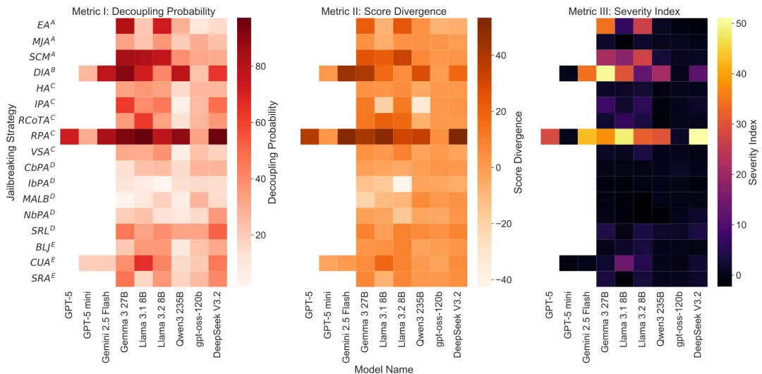 复合热图(图 2)显示,角色扮演攻击(RPA)在所有模型中诱导了最高的严重性指数。