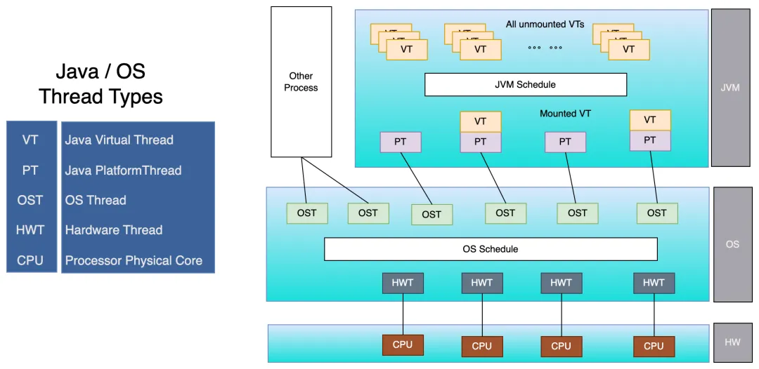 下图展示了虚拟线程、平台线程、OS线程、硬件线程以及物理处理器的关系: