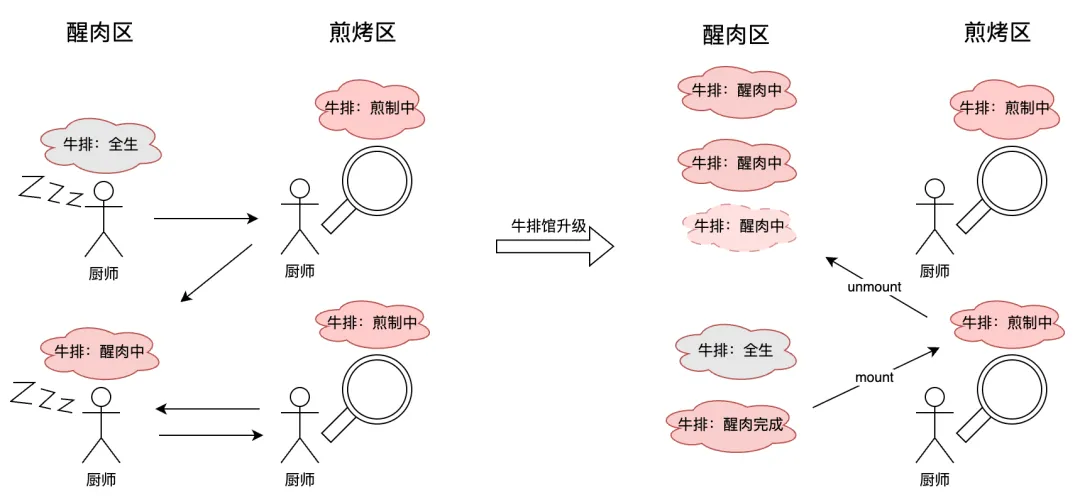 举个生动的例子来说明调度模块,JDK 开了一家米其林牛排馆,生意火爆,店里有 n 个灶台。为了做出好吃的牛排,需每个牛排需要反复经过煎炒、醒肉(将牛排静置一段时间)、再次煎炒的操作。起初, JDK 聘请了很多厨师,每当牛排煎至半熟,厨师会带着自己的牛排离开拿去静止醒肉,灶台让给其他厨师。可是厨师工资昂贵,数量有限,JDK 就在想,能不能让厨师和牛排解绑,醒肉的时候厨师完全可以立刻煎制另一块牛排,牛排醒肉结束后也可以让空闲的厨师继续煎制,这样厨师就没法偷懒了!