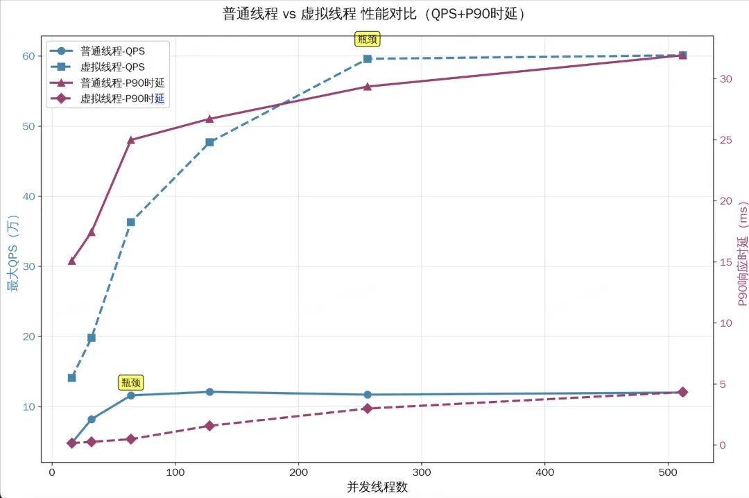 可以看到,使用虚拟线程后吞吐、时延钧大幅优化,且可以通过提高并发线程数来进一步提高吞吐。