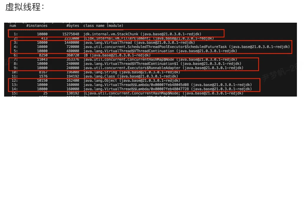 实验结果:创建 10k 个平台线程堆外占用约 349MB;使用虚拟线程堆外占用 8.5MB,Java Heap 大小约为 43MB