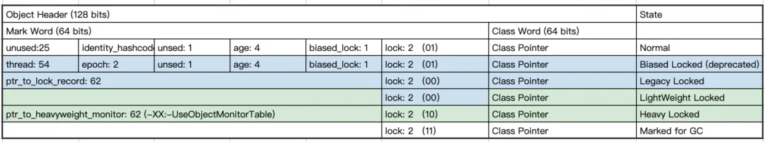 为了帮助大家理解为什么 Synchornized 会导致虚拟线程”死锁“,我们简单介绍下对象头与锁模式在最新 JDK 版本的实现。64 位架构的对象头示例如下:Mark Word表示存储锁、GC、HashCode等状态,Class Word 存储对象指向它的类型元数据的指针。 MarkWord 在不同锁状态下用于存储不同信息。