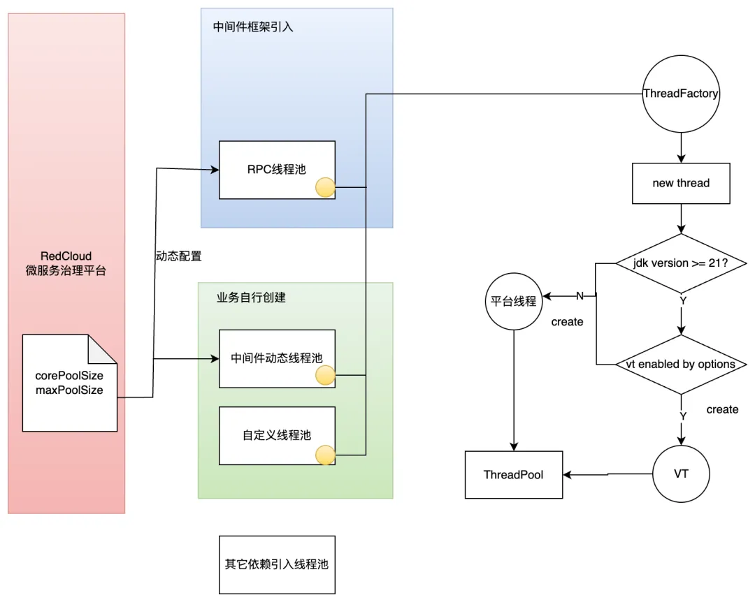 我们与中间件框架、引擎架构同学合作,替换线程池内的 ThreadFactory 实现,根据 JDK 版本与启动参数识别是否使用虚拟线程——基本不需要改业务代码。支持用户自定义线程池切换到经过封装的 ThreadFactory,统一控制。结合 RedCloud 微服务治理平台能力,可以运行时动态调节线程池配置,便利享受虚拟线程无压力扩容的优势。
