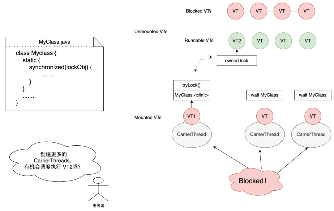 生产中最可能遇到类加载导致的阻塞,这里用一个典型场景举例:我们假设有一个 VT-1 进入类加载逻辑中,会被标记为 Pinning VT。如果此时获取锁失败并进入等待,由于其 Pinning 状态导致不会从 CarrierThread 上卸载,以及其它想要访问这个类的 VT 同样不会 unmount,它们会等到类加载完成后继续执行。那么这里就产生了问题:假设锁已经被一个 unmounted VT-2 持有,所有挂载在 CarrierThreads 上的 VT 都在等待类加载完成,耗尽了所有线程资源,那么 unmounted VT-2 就不会有机会得到执行,锁也不会得到释放,一个由于资源耗尽导致的死锁就形成了。