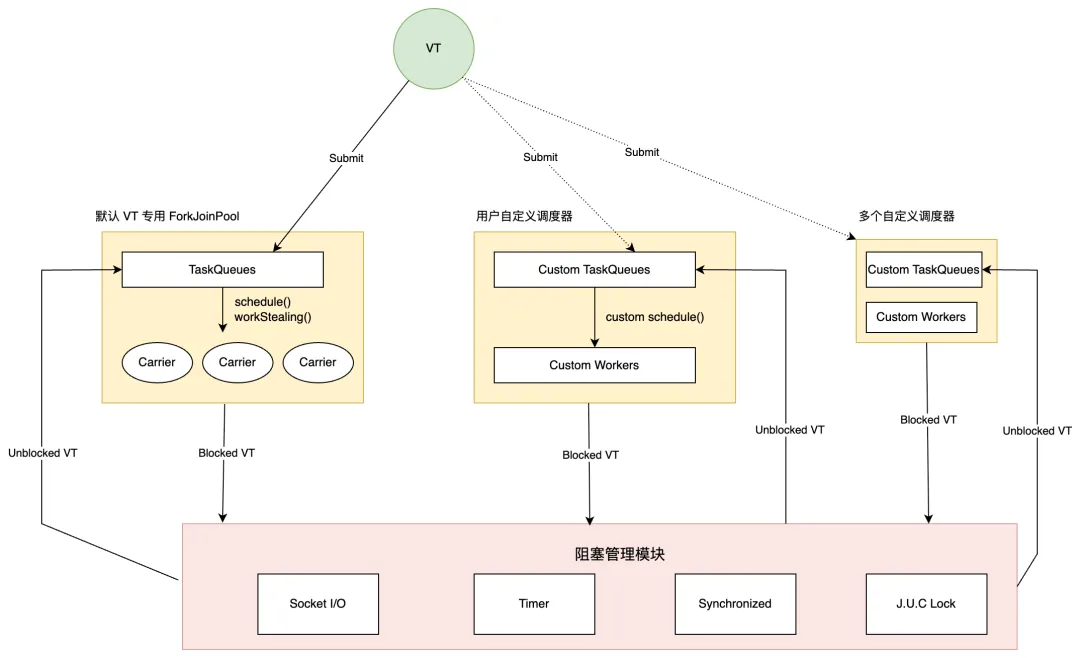 下图左侧体现了虚拟线程调度策略,右侧展示了 OpenJDK21 中的阻塞管理模块。