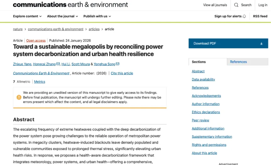 Yang, Z., Zhang, H., Li, H. et al. Toward a sustainable megalopolis by reconciling power system decarbonization and urban health resilience. Commun Earth Environ (2026). https://doi.org/10.1038/s43247-026-03198-4全文链接:https://www.nature.com/articles/s43247-026-03198-4#citeas