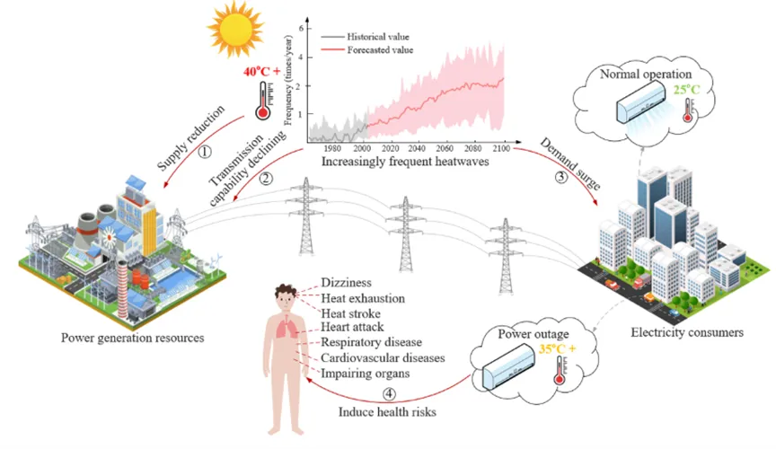 气候变化正持续推高极端热浪的频率与强度。热浪来袭时,制冷负荷激增、输电线路热降额、机组效率下降与局部拥塞叠加,使城市电网更易出现供需失衡并触发停电(图1)。尽管整体可靠性在技术与经济发展下有所提升,但中国2019–2021年县域停电数据表明:相较同地区非热浪日,热浪日停电频次约增加4%,停电持续时间约增加8%。