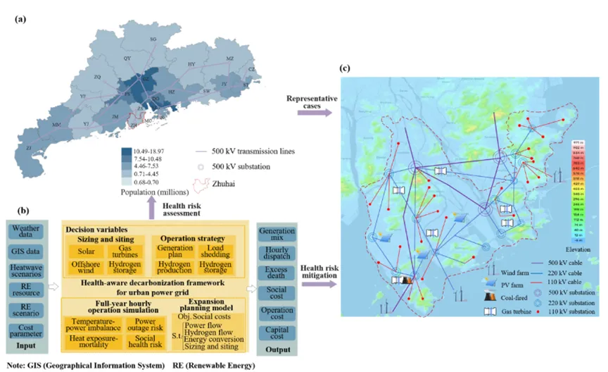 高比例可再生能源的深度整合在推动脱碳的同时,也可能压缩系统灵活性并加剧电网拥塞,使城市电网在极端天气下更易出现供需失衡,从而带来更频繁的停电风险,并进一步放大公共健康风险与超额死亡。为系统评估这一问题,我们以粤港澳城市群为例,构建了2030—2050年面向碳中和的城市电网能源转型路径,并建立“极端热浪—电力失衡—热暴露—超额死亡”的耦合框架,量化脱碳转型背景下停电对热浪健康损失的影响(图2)。