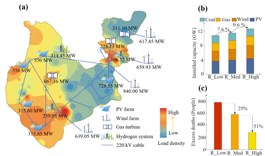 在R_High情景下,新建电源(可再生+燃气机组)优先布局在高负荷密度区域以减少限电,同时在可再生能源附近配置电解槽以提升就地消纳。对比结果显示:相较R_Low,R_Med为应对热浪将发电容量提高约7.6%,使超额死亡下降约25%;在此基础上,R_High进一步增加约9.6%装机,将超额死亡从775降至283(下降63%)(图4)。