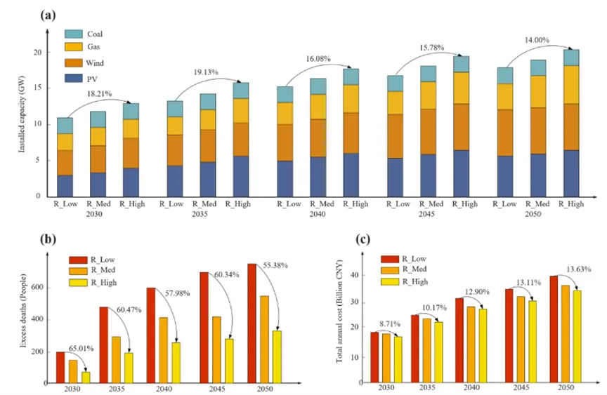 随着气候变化加剧,珠海等亚热带城市未来将面临更频繁、更高强度的热浪风险(SSP2-4.5下高强度热浪概率由2020–2040年的14.89%升至2050–2070年近40%),由此带来的超额死亡与经济损失将持续上升。为此,我们将热浪频率增长与电源成本下降同时纳入2030–2050扩展规划,评估健康感知脱碳策略的可行性。结果表明,相比不考虑健康的方案,健康感知方案(R_High)通过提升韧性水平(总装机增加10%以上、光伏增加20%以上)可在2030–2050期间将预期超额死亡降低约50%,且随着技术进步与热浪增多带来的更高利用率,其经济优势随时间增强:年总成本相对基准方案的降幅从2030年的8.71%扩大到2050年的13.63% (图6)。这些发现说明,将健康风险显式纳入电力脱碳规划不仅能显著改善公共健康,也具备长期的经济合理性。