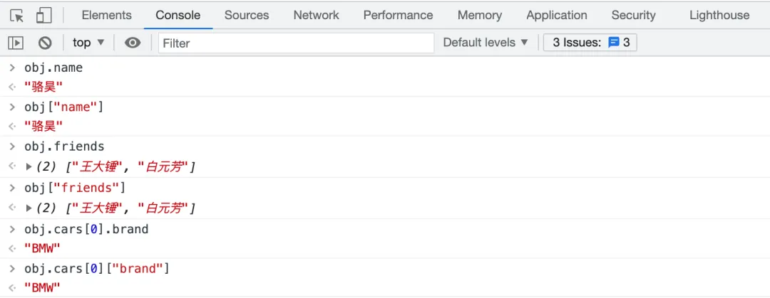 上面的obj就是JavaScript中的一个对象,我们可以通过obj.name或obj["name"]两种方式获取到name对应的值,如下图所示。可以注意到,obj["name"]这种获取数据的方式跟Python字典通过键获取值的索引操作是完全一致的,而Python中也通过名为json的模块提供了字典与JSON双向转换的支持。