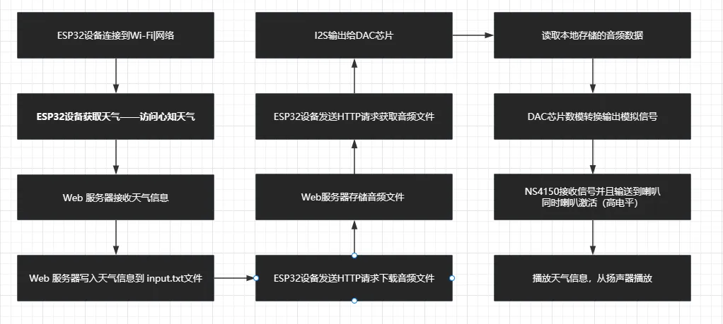 项目通过 ESP32 联网获取心知天气的实时数据,将文本信息经 Web 服务器转发至 PC 端,并调用科大讯飞 TTS 接口生成语音文件,最终由 ESP32 下载音频并通过 I2S + DAC 播放出来。
