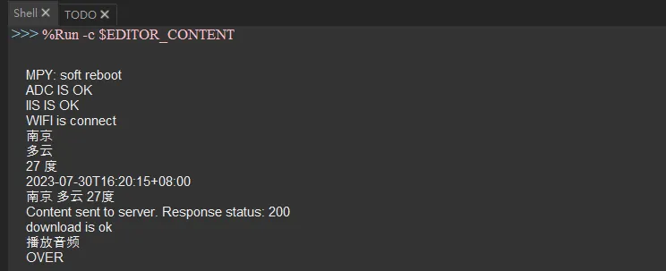 result1=urequests.get('https://api.seniverse.com/v3/weather/now.json?key=密钥location=城市&language=zh-Hans&unit=c')#获取api的数据,即为天气的json j1=ujson.loads(result1.text)#解析# print(j1['results'][0]['location']['name'],end=' ')#城市名字# print(j1['results'][0]['now']['text'],end=' ')#天气情况# print(j1['results'][0]['now']['temperature'],end='℃ ')#温度# print(j1['results'][0]['last_update'])#数据更新时间 city = j1['results'][0]['location']['name'] weather = j1['results'][0]['now']['text'] temp = j1['results'][0]['now']['temperature'] fresh_time = j1['results'][0]['last_update'] print(city) print(weather) print(temp,"度") print(fresh_time) # 获取要发送的内容,读取 content = city + " " + weather + " " + str(temp) + "度 " print(content) send_content_to_server(content)#向服务器的input写入这个文本 # 下载WAV文件并保存到ESP32 download_wav_file(server_wav_url, esp32_wav_path) #uart_test print("download is ok")#下载成功 wavtempfile = "output.wav" wav = open(wavtempfile,'rb') print('播放音频') # 播放开始时间 start_time = time.ticks_us() # 读取音频文件的二进制数据 buf = wav.read() # wav文件的头部数据,不是实际的音频数据,是文件信息,所以我们要丢弃这部分数据 bufhead = 44 # 实际音频数据大小,等于总大小减去头部信息的大小 bufsize = len(buf) - bufhead # 缓冲区大小,前面初始化的时候设置的最后一个参数 bufcap = 4096 # 下面的0.032得来的方法:16000(采样率) x 16(采样位宽,我用的是16位音频,单位bit) x1(通道数,单声道1,立体声n) ÷ 8(1字节=8bit) ÷ 1000000(秒换算成微秒) # 音频总时长 us(微秒) all_time = bufsize / 0.032 # 写入DAC的次数 bunum = 1 # 要写入的数据 开始位置 bufstart = bufhead # 循环读取 while bufsize: # 读取结束位置,等于读取次数*缓冲区大小 bufend = bufcap * bunum # 当结束位置大于总数据长度的时候,结束位置等于数据最后一位 if bufend > len(buf): bufend = len(buf) # 要写入的数据 bufwrite = buf[bufstart:bufend] # 写入数据 num_written = audio_out.write(bufwrite) # 总大小减去每次写入的大小 bufsize -= len(bufwrite) # 重新设置读取位置,为上次结束后一位 bufstart = bufend # 读取次数 bunum = bunum + 1 # 等待音频播放完 while 1: # 播放结束时间 end_time = time.ticks_us() # 如果当前时间减去开始播放的时间大于音频时长 if (end_time - start_time) > all_time: # 取消初始化 I2S 总线 audio_out.deinit() # 停止等待 break # 播放完毕 # 关闭文件 wav.close() print("OVER")#音频播放完毕,进入下一个天气播报循环 time.sleep(20)