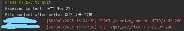 def send_content_to_server(content): url = "http://IP地址:端口号/receive_content" # 请替换为你电脑的IP和端口号 content_utf8 = content.encode('utf-8')#编码 headers = {'Content-Type': 'text/plain'} response = urequests.post(url, data=content_utf8, headers=headers) print("Content sent to server. Response status:", response.status_code) response.close()def download_wav_file(url, save_path): response = urequests.get(url) with open(save_path, 'wb') as file: file.write(response.content)# 服务器端存放WAV文件的URLserver_wav_url = 'http://跟前面那个一样/get_wav_file'# ESP32端存放WAV文件的路径,请根据实际情况修改esp32_wav_path = '/output.wav'