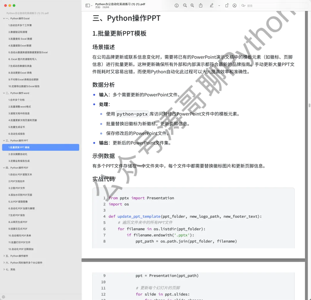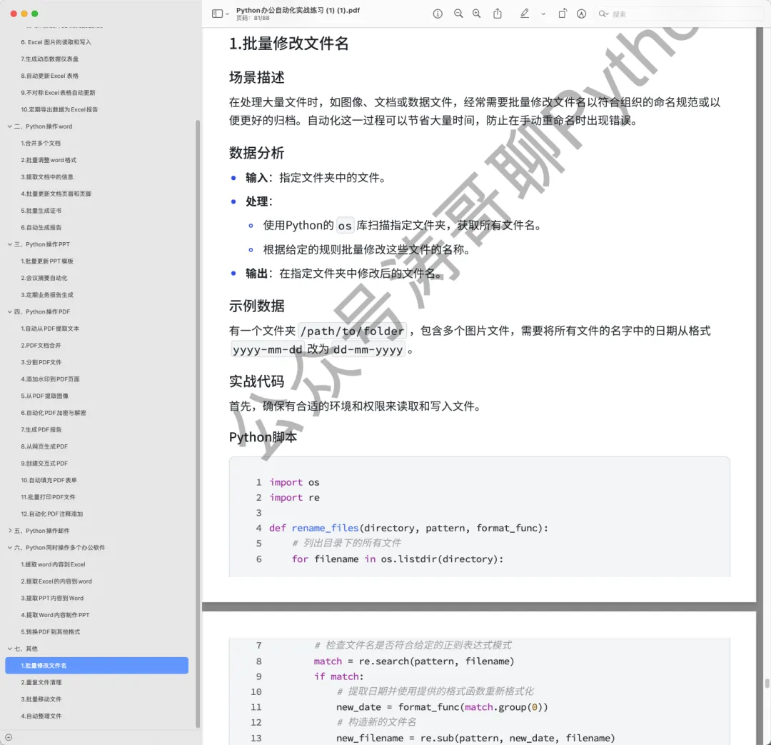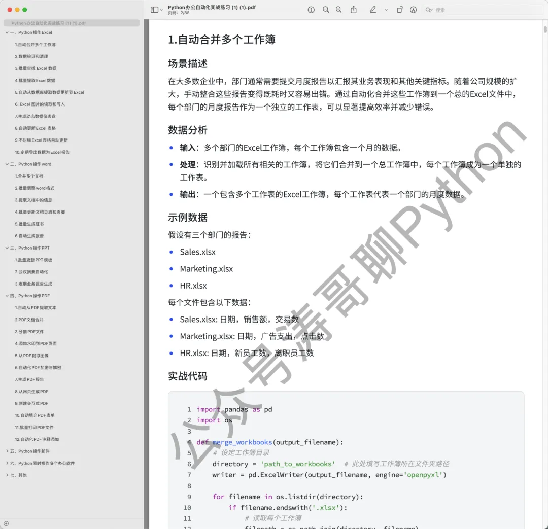 整理的实战项目都是日常工作中,经常遇到的。例如批量合并多个工作簿的内容,添加水印到PDF,批量修改文件名,还有自动化收发邮件、整理邮件。
