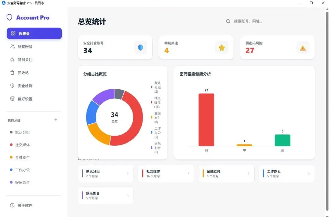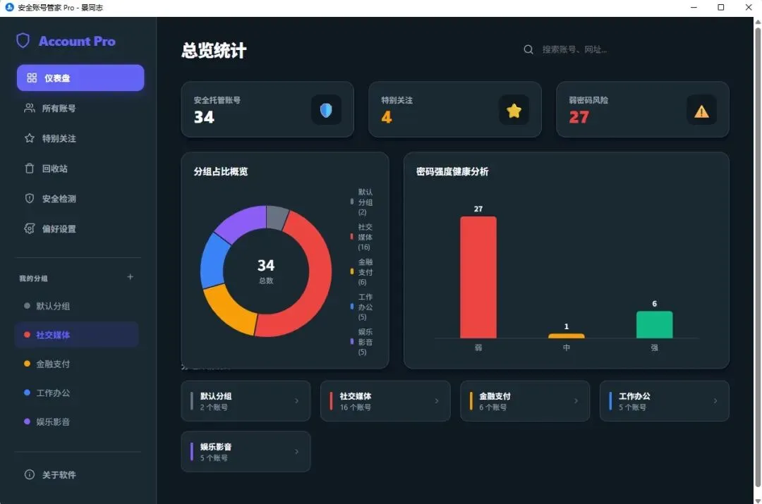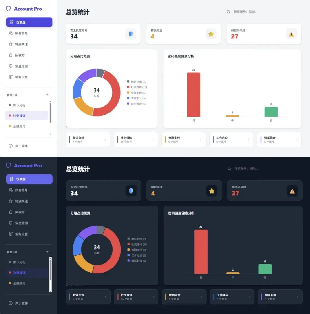 * 📶 健康度体检:右下角柱状图自动分析——有多少弱密码?有多少高强度密码?体检报告秒出!