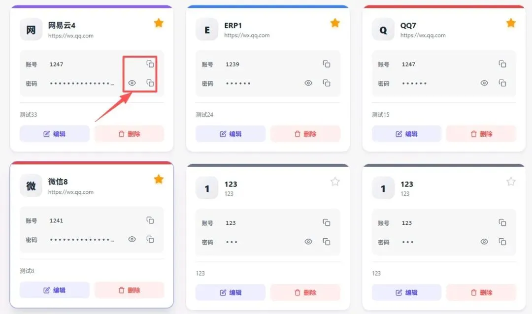* 🙈 防窥模式:列表密码默认显示为 ▪️▪️▪️▪️▪️▪️,防止身后有人偷瞄!鼠标长按小眼睛才显示,松开立马隐藏。