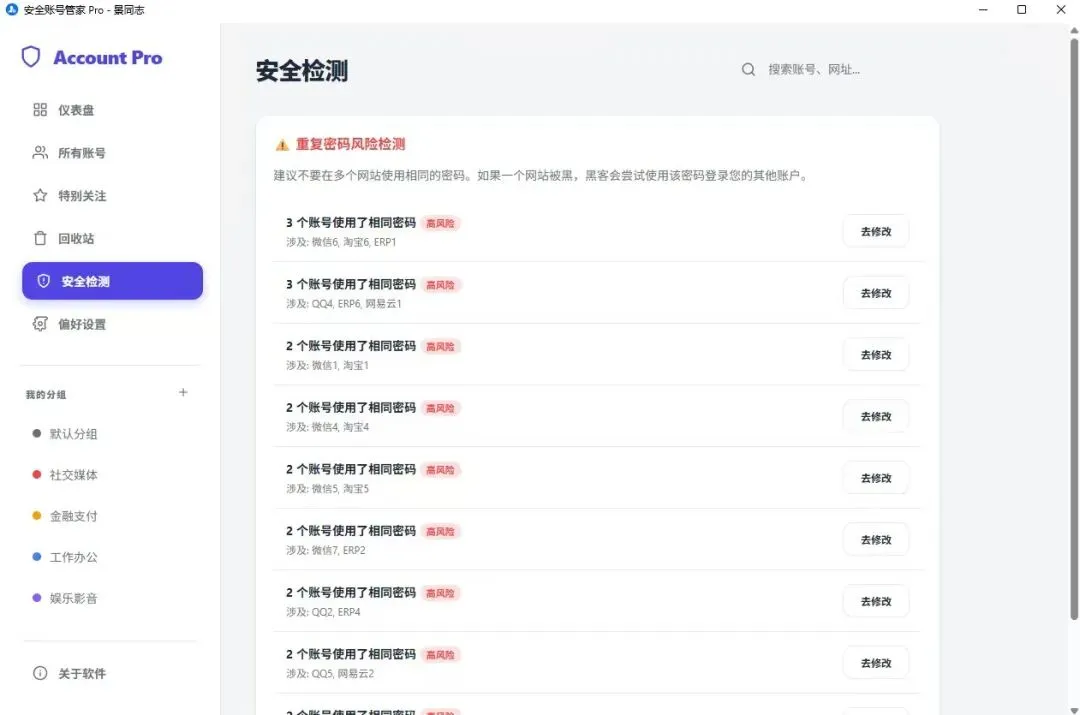 * 🕵️♂️ 重复密码检测:Pro 版杀手锏! 点击「安全检测」,全盘扫描揪出那些你偷懒共用的密码。拒绝撞库,从这里开始! 🚫