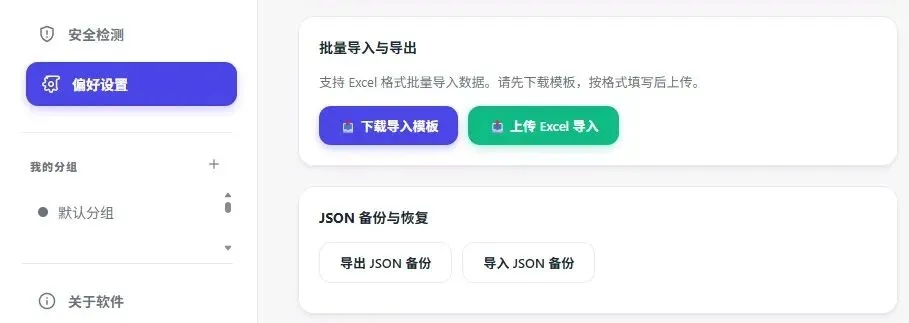 * 📥 批量导入:下载标准模板,把原本散落在 Excel 里的几百个账号填进去,一键上传,瞬间入库并加密!