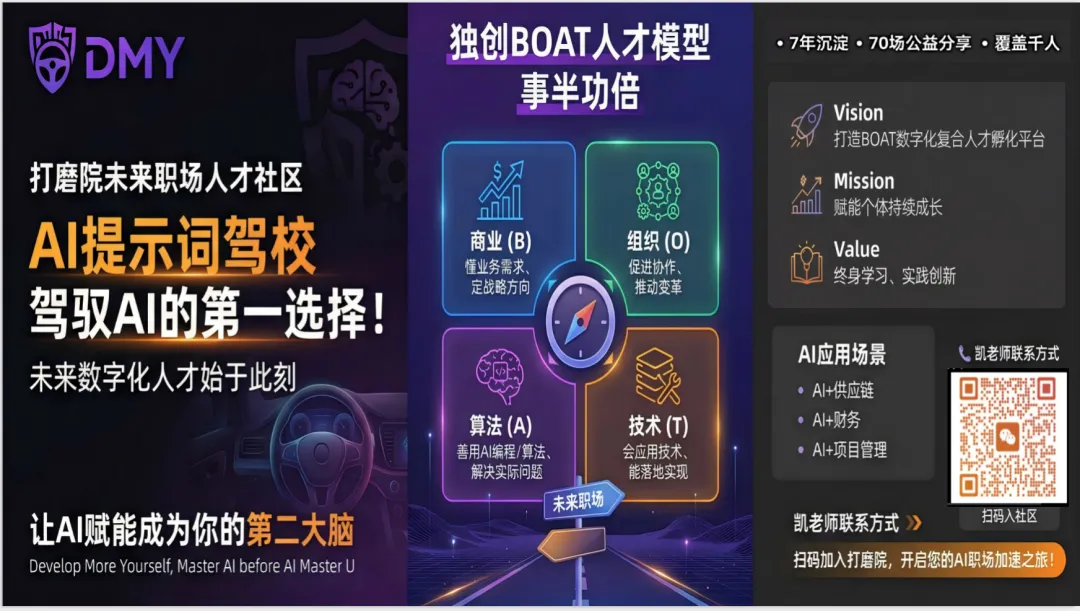 编程语言(Java/Python)→ 框架(Spring/Django)→ 数据库 → 前端 → 运维学习曲线:1-2年适用场景:职业开发业务梳理 → 工作流设计 → 提示词表达 → 沟通澄清 → 迭代优化学习曲线:3天适用场景:所有需要解决问题的场景AI 时代,工具会过时,思维永不过时!