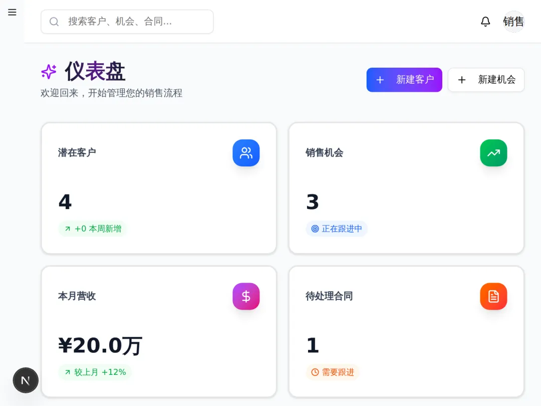 核心模块:1. 租户管理(多租户基础)2. 用户管理 + 权限系统3. 客户管理(线索 + 客户)4. 销售流程(商机 + 合同 + 支付)5. 交互记录(客户沟通历史)6. 工作流(自动化流程)技术栈推荐:- 前端:Next.js 16 + React 19 + shadcn/ui- 数据库:PostgreSQL- ORM:Drizzle- UI:Tailwind CSS这一步的核心不是"学框架",而是: