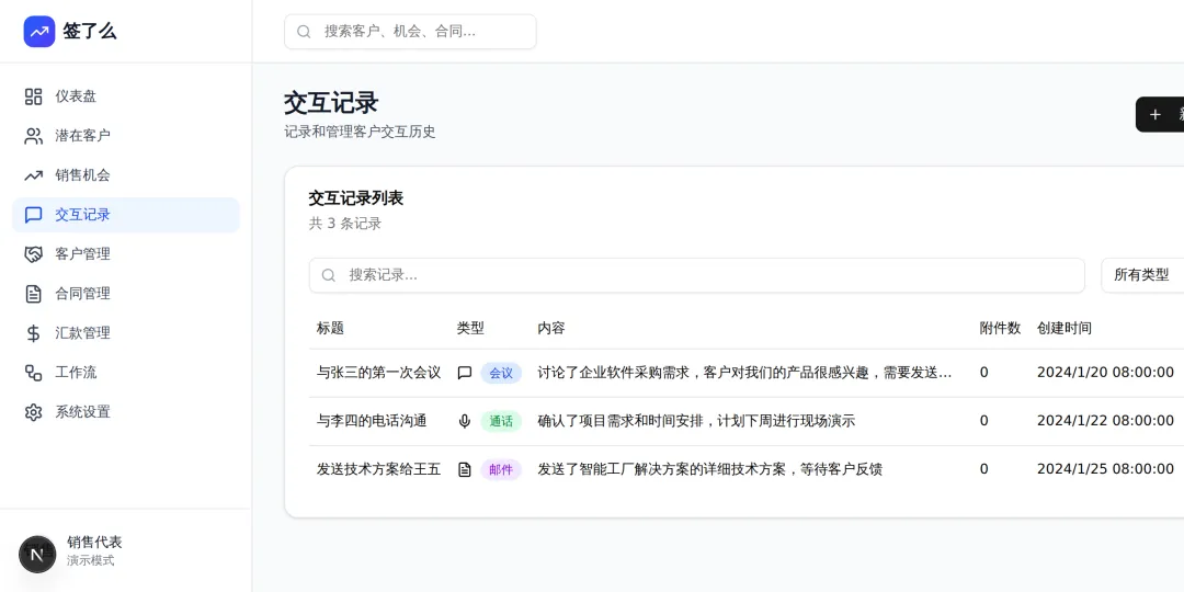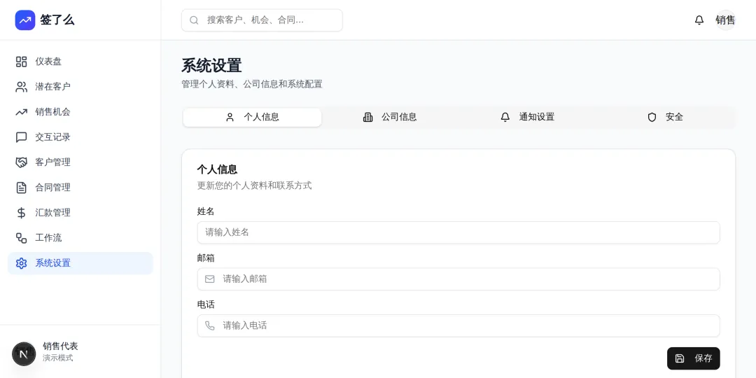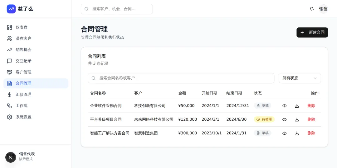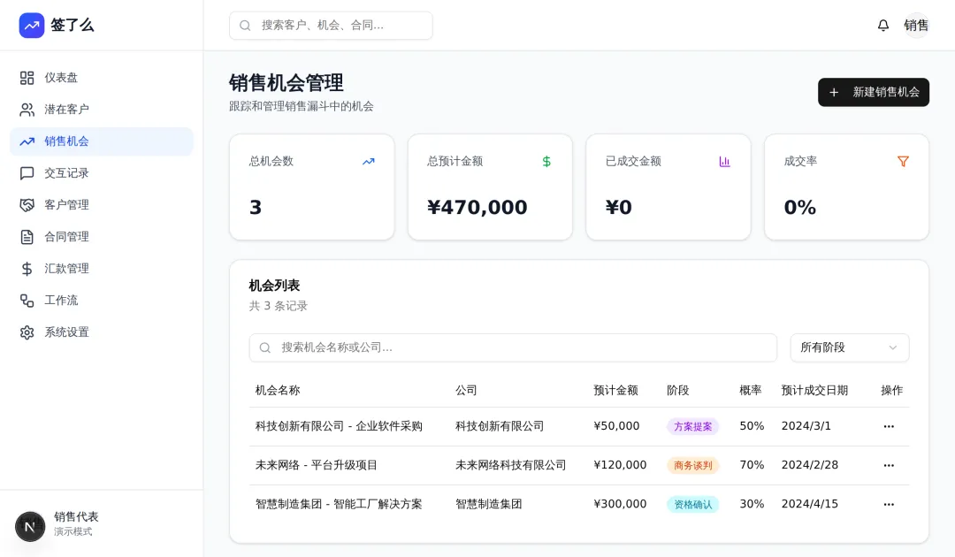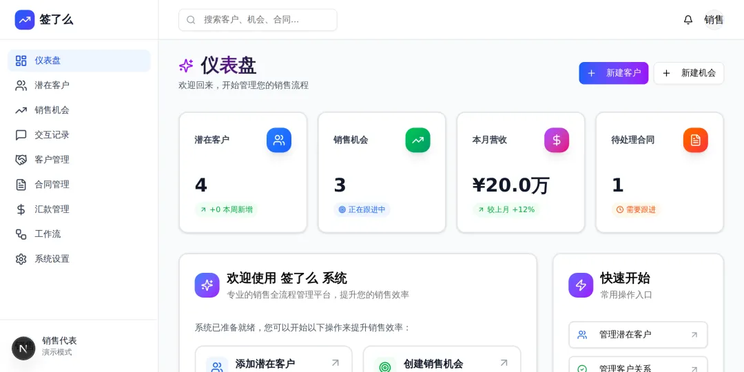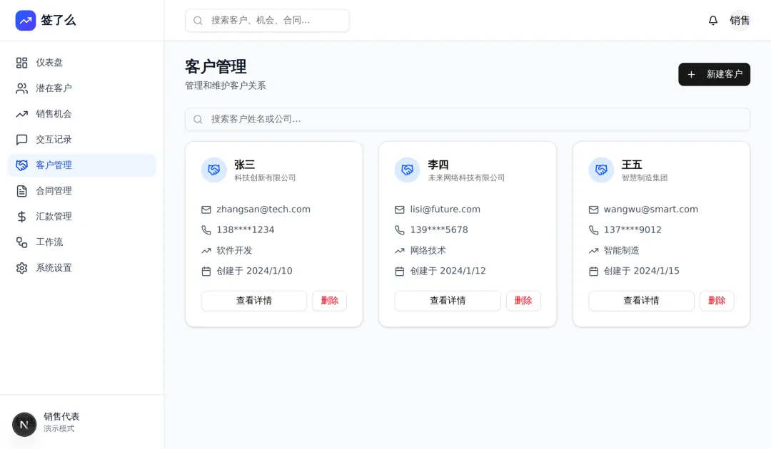 ✅ 多租户架构 - 一个系统支持多个公司独立使用✅ 客户管理 - 完整的客户生命周期管理✅ 销售漏斗 - 可视化商机跟踪,预测成交金额✅ 合同管理 - 合同签订、到期提醒✅ 支付管理 - 支付记录、逾期提醒✅ 权限系统 - 5种角色,精细化权限控制✅ 交互记录 - 完整的客户沟通历史✅ 工作流 - 自动化业务流程