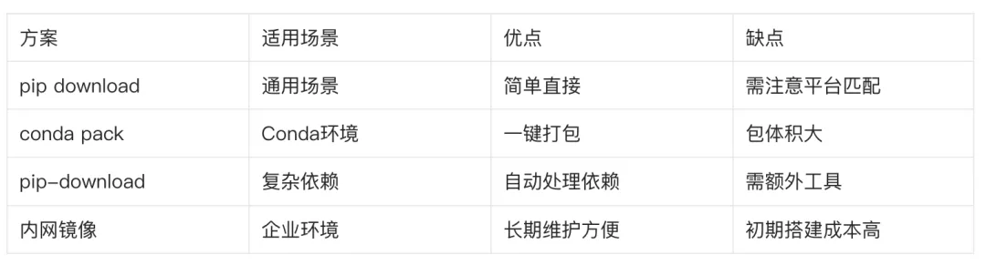 # 定期更新离线包库pip download -r requirements.txt -d /path/to/repo# 使用时指定仓库pip install --no-index --find-links=/path/to/repo package_name