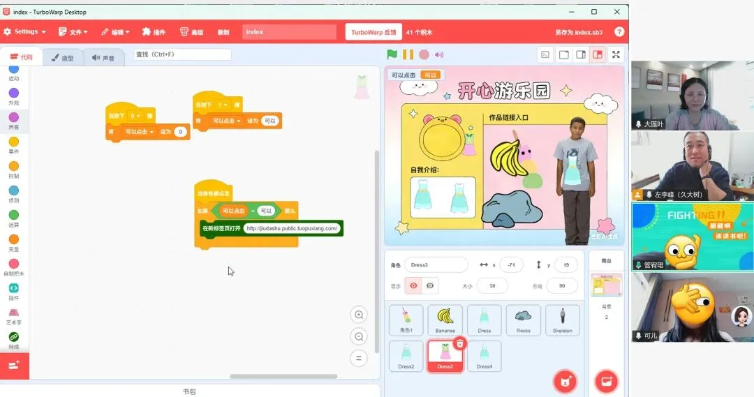 我是大莲叶,是这堂课的助教。主讲老师久大树带着孩子们搭建“开心游乐园”时,程序突然报错了。