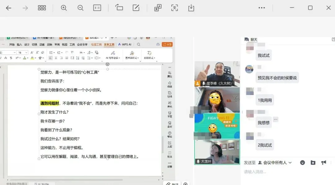 久大树没有直接继续往后面讲解,而是请其中一个孩子,用自己的话把问题再说一遍。“就是……我想让角色跳转到另一个场景,但它总出错……”课程结束后,我带着孩子们总结,从“不知道”到“找到解决方案的素养能力”——我说:“恭喜你们,刚刚自己启动了一项很厉害的能力——觉察力。”我在学习单上记下了这个突破时刻。并且让孩子们再屏幕上把这项素养能力打出来,即使有错别字,也不影响孩子们对这项能力的认识与发现。【第二部分:为什么孩子会常说“不知道”?】
