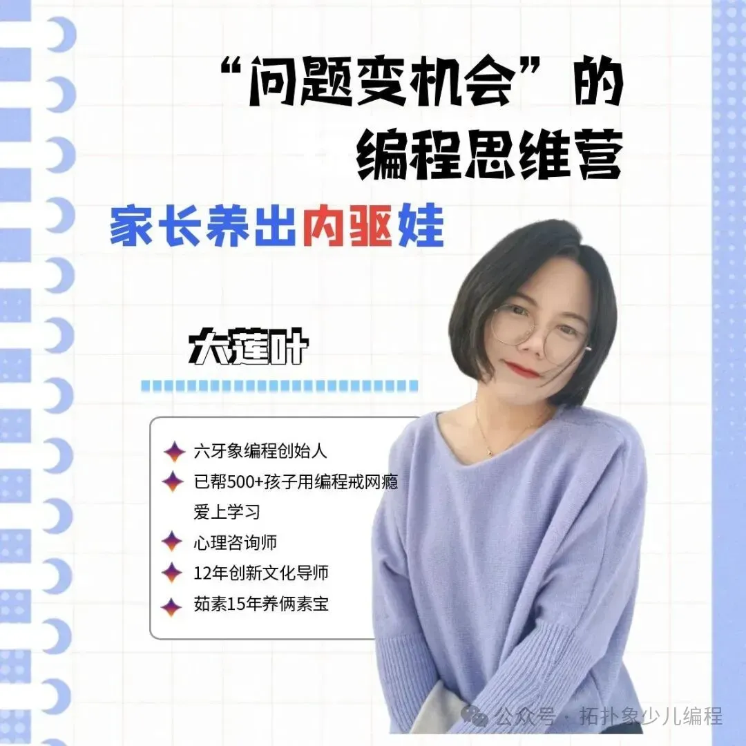 适合:5-13岁孩子家长(无需编程基础,重在思维共建)这不是一场“教孩子写代码”的速成课,而是一次亲子思维系统的小型升级。👉 把“妈妈我不会”变成“我卡在第三步的循环条件上”👉 从“要我做”到“我想试试”—让孩子在“最小作品”中体验心流因为这不仅仅是一杯豆浆的心意,更是我想对你——屏幕前认真陪伴孩子成长的同行者——发出的一份郑重邀请。绿满仓走过的13年,是从“教编程”到“育思维”的探索之路,也是从“关注结果”到“守护过程”的回归之路。(30个名额满员即关闭通道,确保每位参与者都能获得深度陪伴)所有疑问都能在课里找到答案~��现在锁定名额,即可解锁3天核心课+1节定制加餐(原价12800),还有专属陪跑社群,实时解答你的养育困惑。名额有限,先到先得,让我们一起告别焦虑,用编程思维养出自主、自信、高分的孩子!