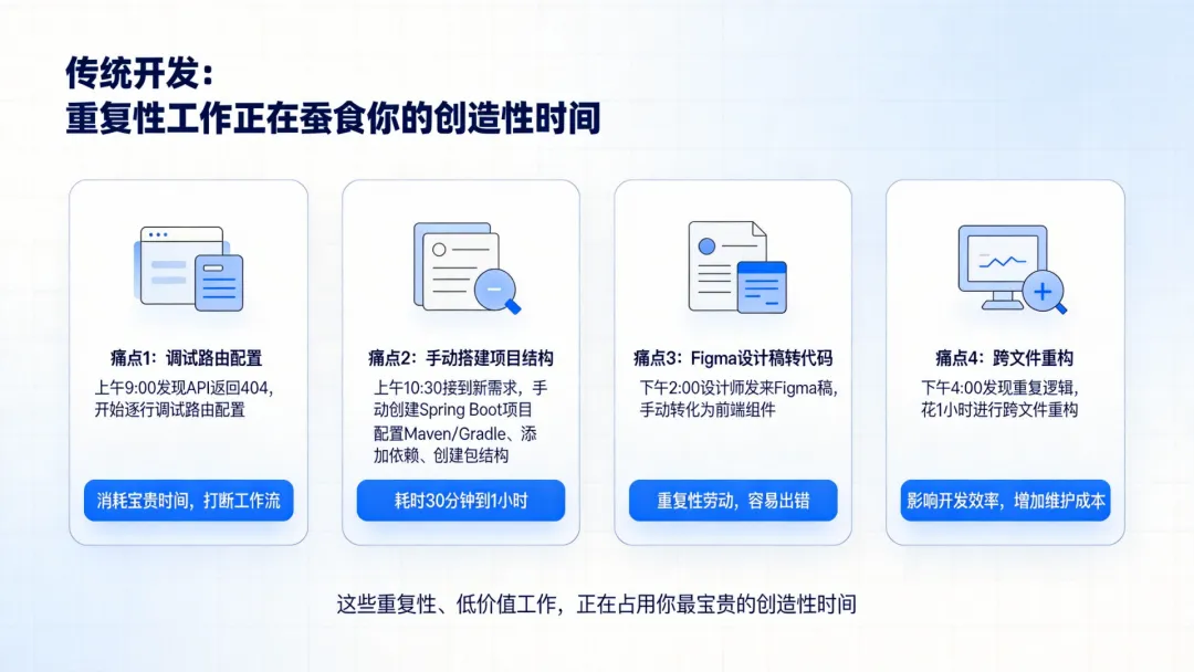 这个过程至少需要30分钟到1小时。而这仅仅是个开始——接下来的测试、部署、文档,每一项都是时间黑洞。