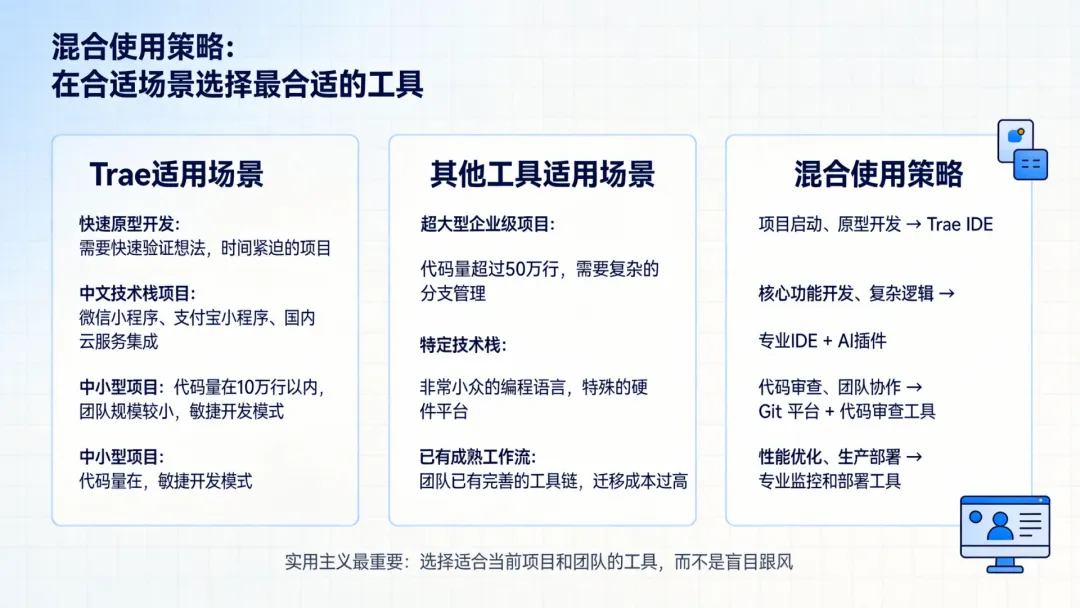 -中小型项目:使用Trae全程开发-大型项目:用Trae快速原型,再迁移到专业IDE