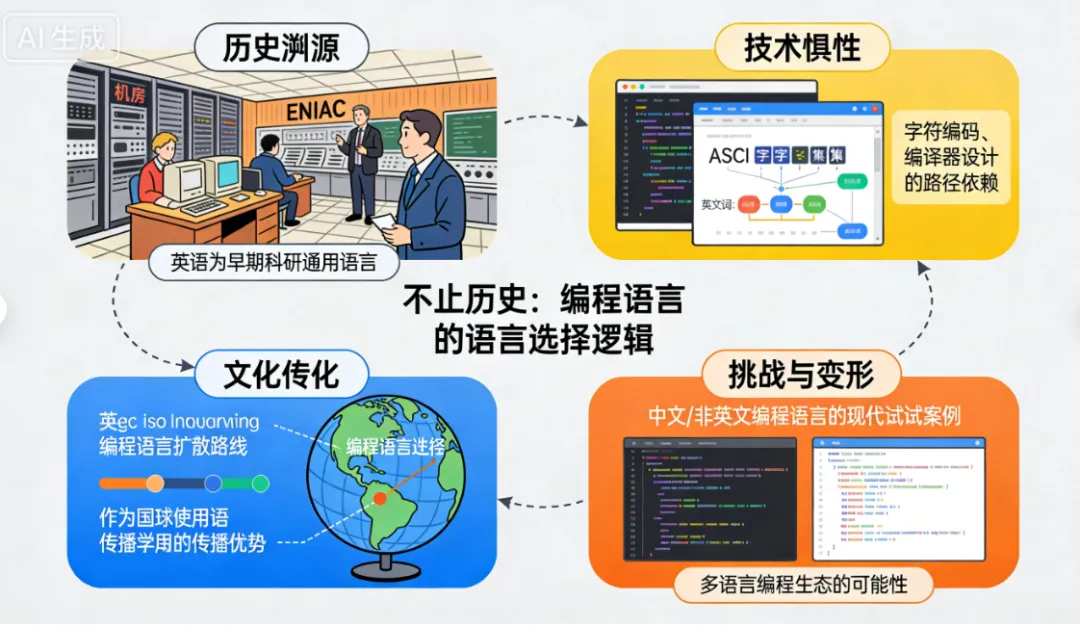英文编程之所以难以撼动,更深层的原因在于其已经形成了强大的全球生态系统和网络效应。