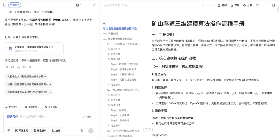文献的质量有高有低,VJmap的作者在网上有篇博文,介绍了他的实现思路,基本是参照西安科技大学张志华博士的半对称建模思路来实现的。张博士在这个方向,发表了很多成果,硕士论文《矿山测量数据处理与三维巷道建模方法研究_张志华》、博士论文《矿山巷道三维网络模型的构建及其路径分析方法研究_张志华》、专业书《矿山巷道三维网络模型构建及空间网络分析技术》。有了VJMap的成功验证,我就重点让AI帮助我分析张博士的论文了。