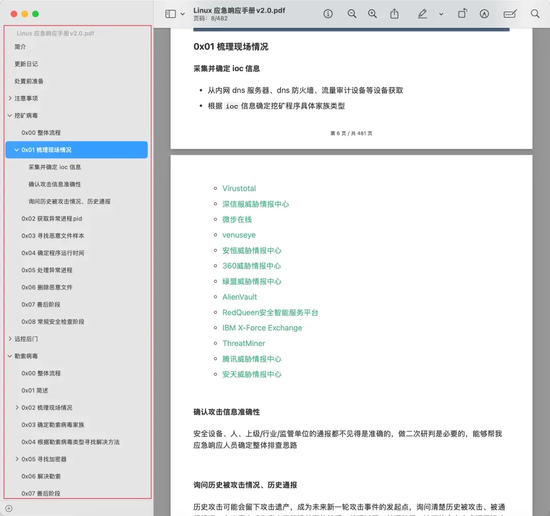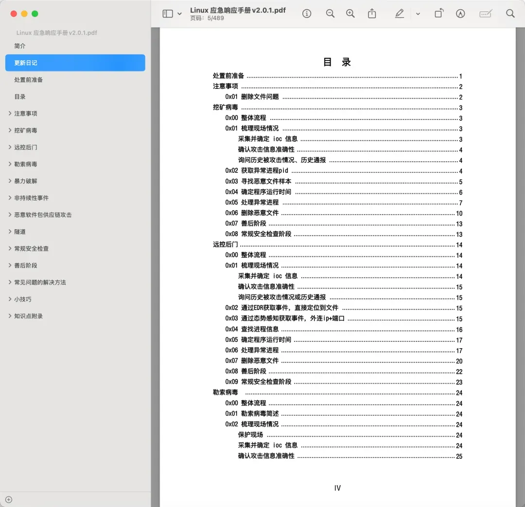 应急响应(也称为网络安全应急响应)是指组织用于检测和响应网络威胁、安全漏洞或网络攻击的流程和技术。应急响应的目标是在网络攻击发生之前进行预防,并尽量减少因网络攻击而造成的成本和业务中断。对于想进入网络安全行业的师傅来说,应急响应工程师也是一个可选择的就业方向,薪资待遇和其它安全岗位差不了多少。作为一名应急响应工程师,你需要十分熟悉应急方案,能快速定位并解决问题。今天就给大家分享一份某大佬整理的《Linux应急响应手册》,内容清晰,非常全面牛叉。