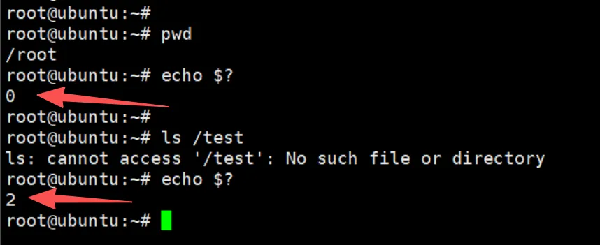 echo $?# 输出0,代表命令成功结束# 输出非0值,代表命令执行失败